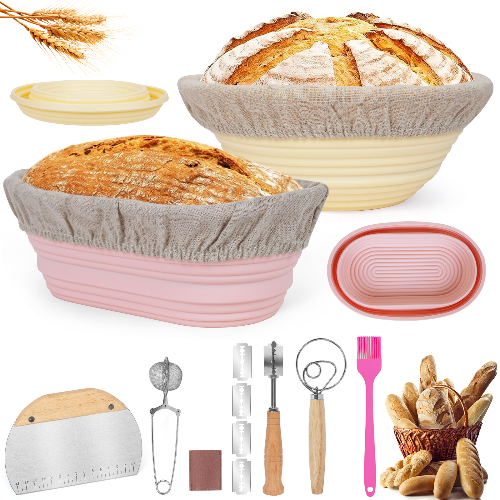 【Komplettes Backset】Unser Gärkörbchen für Brot Set enthält 1 runden Brotkorb und ovalen Brotkorb, 2 Futter aus Baumwolle und Leinen, 1 Messer zum Konturieren von Brot (mit 5 extra Rasierklinge), 1 teigschaber edelstahl, 1 Dänischer Teigbesen und 1 Mehl- und Zuckersieb.