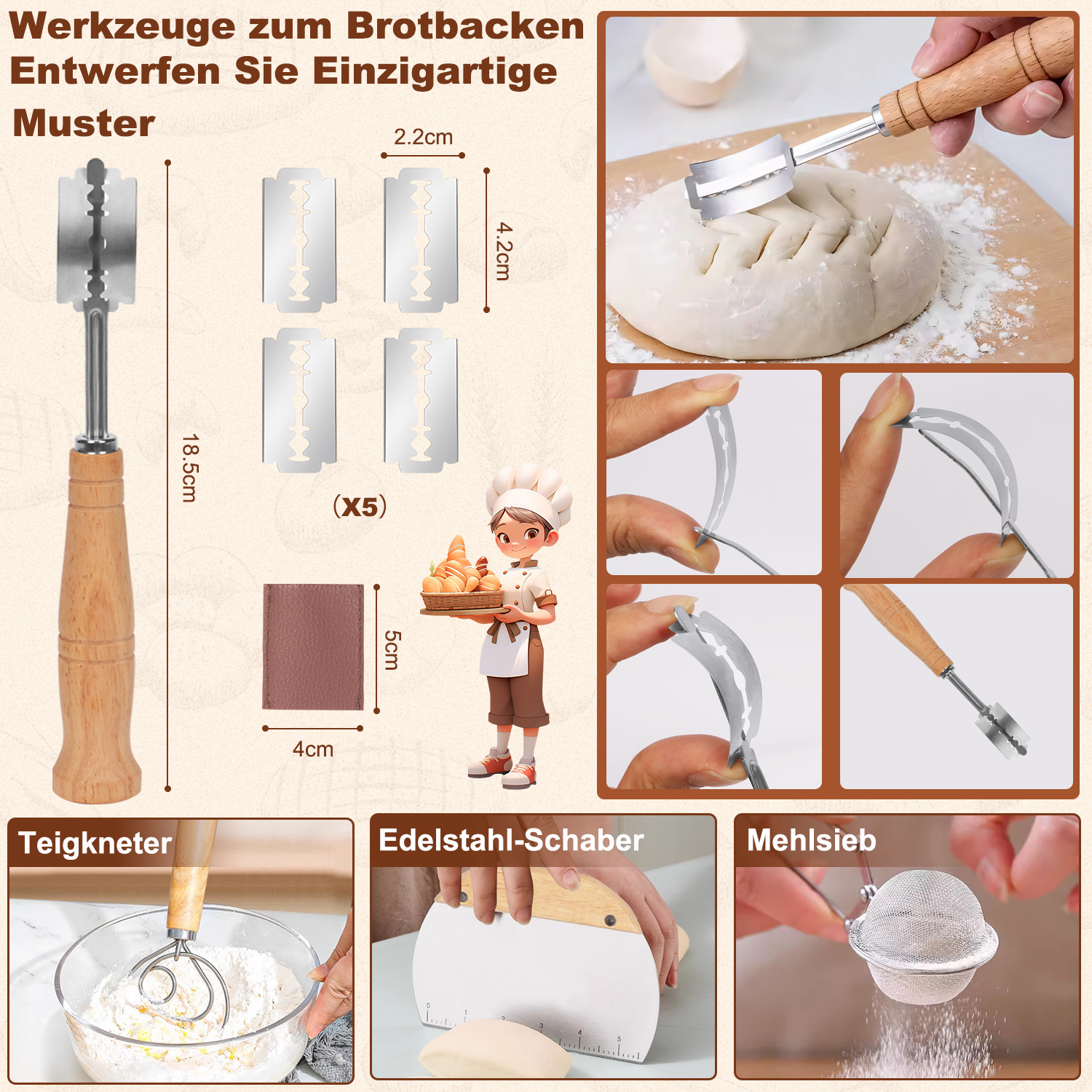 【Ausgestattet mit Grundlegenden Werkzeugen】Sauerteigkneter mit Eichengriff mischt den Teig gleichmäßig; Verwenden Sie einen Teigspatel, um die Form und Größe des gewünschten Teigs anzupassen; Brotkonturmesser helfen bei der Gestaltung einer Vielzahl schöner Brotmuster (es gibt 5 austauschbare Klingen); Silikonbürsten werden zum Bürsten von Öl oder Saucen usw; verwendet. Ein Mehlsieb verteilt Kandiszucker oder Mehl gleichmäßig auf dem Brot.