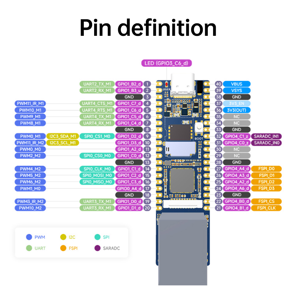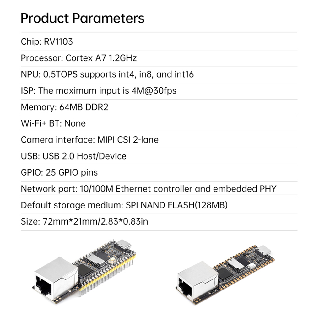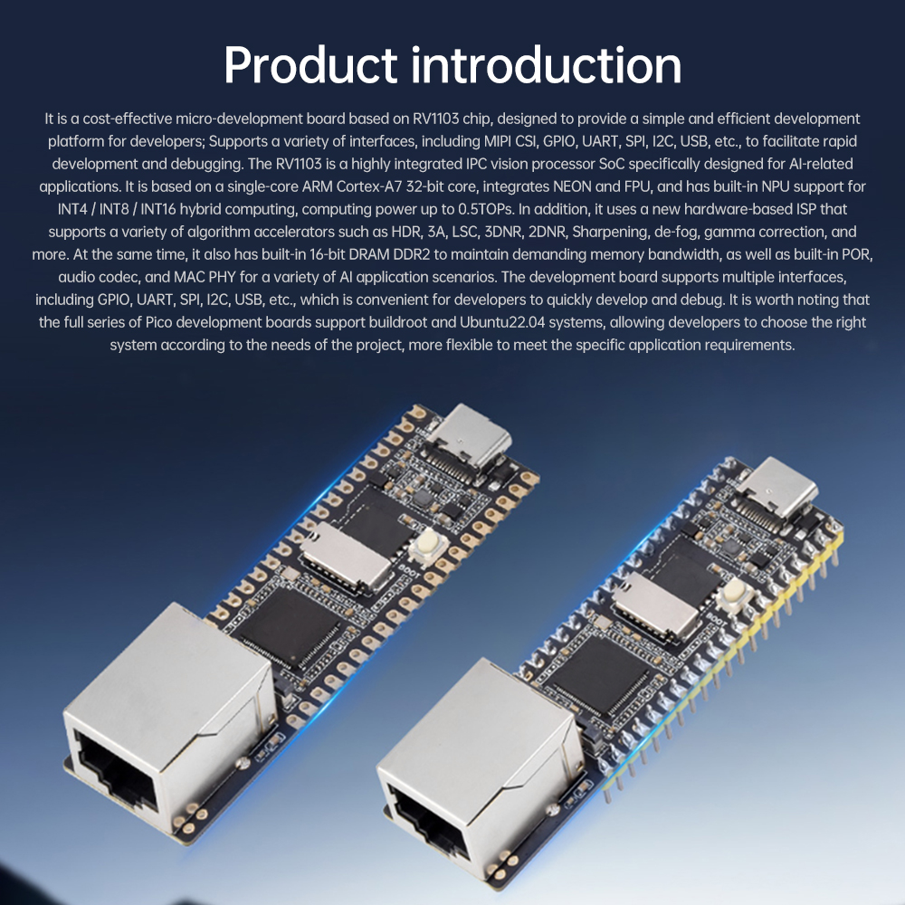 It is based on a single-core ARM Cortex-A7 32-bit core, integrates NEON and FPU, and has a built-in NPU that supports INT4/INT8/INT16 hybrid operations with a computational power of up to 0.5 TOPs. In addition, it adopts a brand new hardware-based ISP, and supports a variety of algorithmic gas pedals, such as HDR, 3A, LSC, 3DNR, 2DNR, Sharpen, Dehaze, Gamma Correction, etc. RV1103 is a highly integrated IPC vision processor SoC specifically designed for artificial intelligence-related applications. , De-fogging, Gamma Correction, etc. It also features built-in 16-bit DRAM DDR2 to sustain demanding memory bandwidth, as well as built-in POR, audio codec and MAC PHY for various AI application scenarios. The development board supports multiple interfaces, including GPIO, UART, SPI, I2C, USB, etc., which facilitates rapid development and debugging for developers. It is worth noting that Luckfox Pico's full range of development boards support buildroot and Ubuntu22.04 systems, allowing developers to choose the right system according to project needs and meet specific application requirements more flexibly.