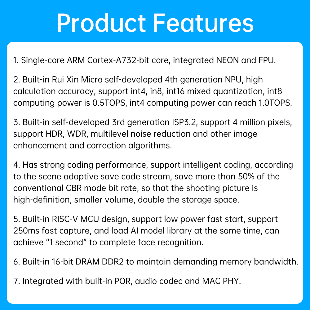 2. Built-in Rayson Microelectronics self-developed 4th generation NPU, high computing precision, support int4, in8, int16 mixed quantization, of which int8 arithmetic is 0.5TOPS, int4 arithmetic up to 1.0TOPS.