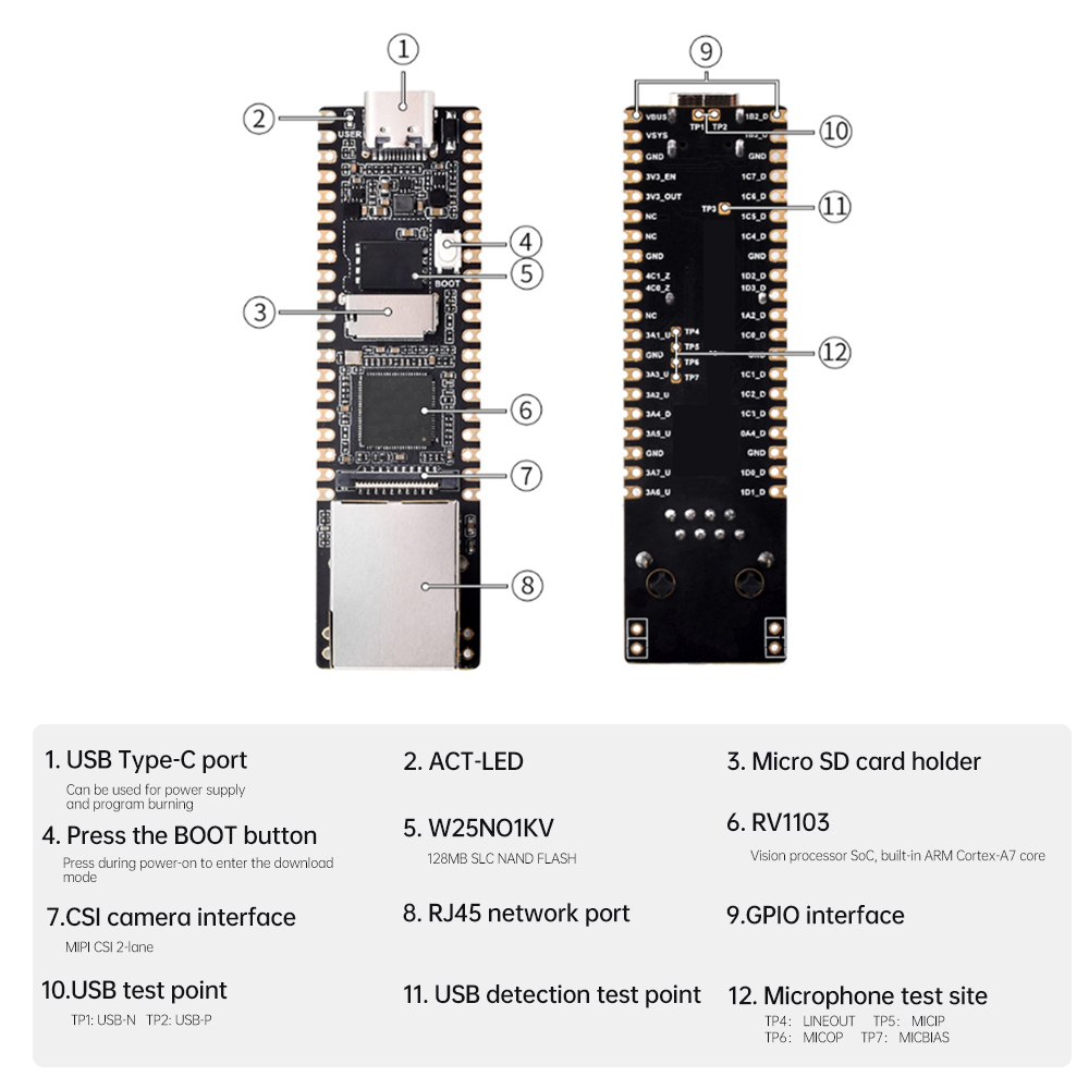 OverviewLuckFox Pico is a cost-effective miniature Linux development board based on the Rexchip RV1103 chip, designed to provide developers with a simple and efficient development platform; supports a variety of interfaces, including MIPI CSI, GPIO, UART, SPI, I2C, USB, etc., which facilitates rapid development and debugging. RV1103 is a highly integrated IPC vision processor SoC for AI-related applications.