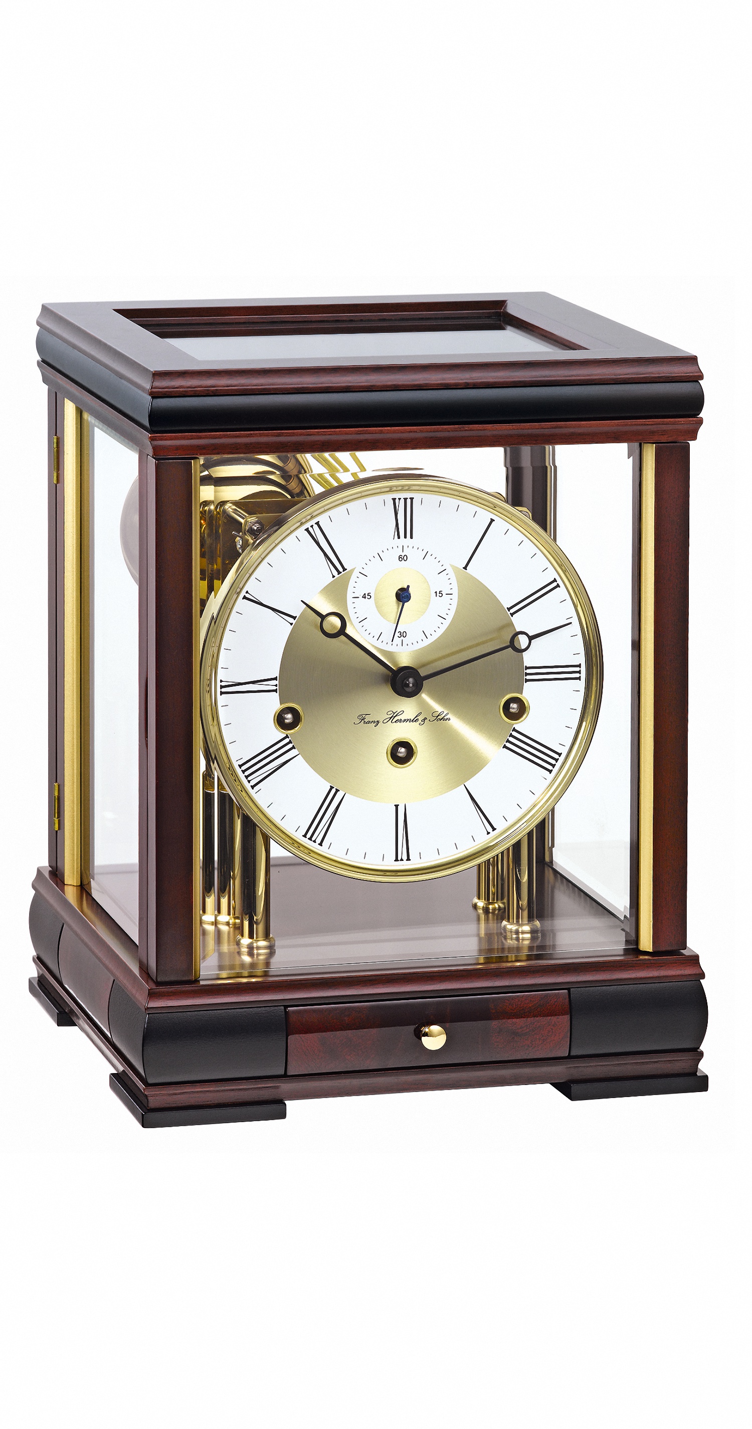 A new classic highlight from the Hermle collection is this timelessly elegant table clock made of fine mahogany, walnut or cherry tree. With its complete transparency, this watch offers an impressive view of the Hermle Westminster striking mechanism W0352 with the harmonious gold-white dial design. 8-day 4/4 Westminster striking mechanism on 4 polished bell seconds display, an 11-stone Swiss escapement and automatic night shut-off.