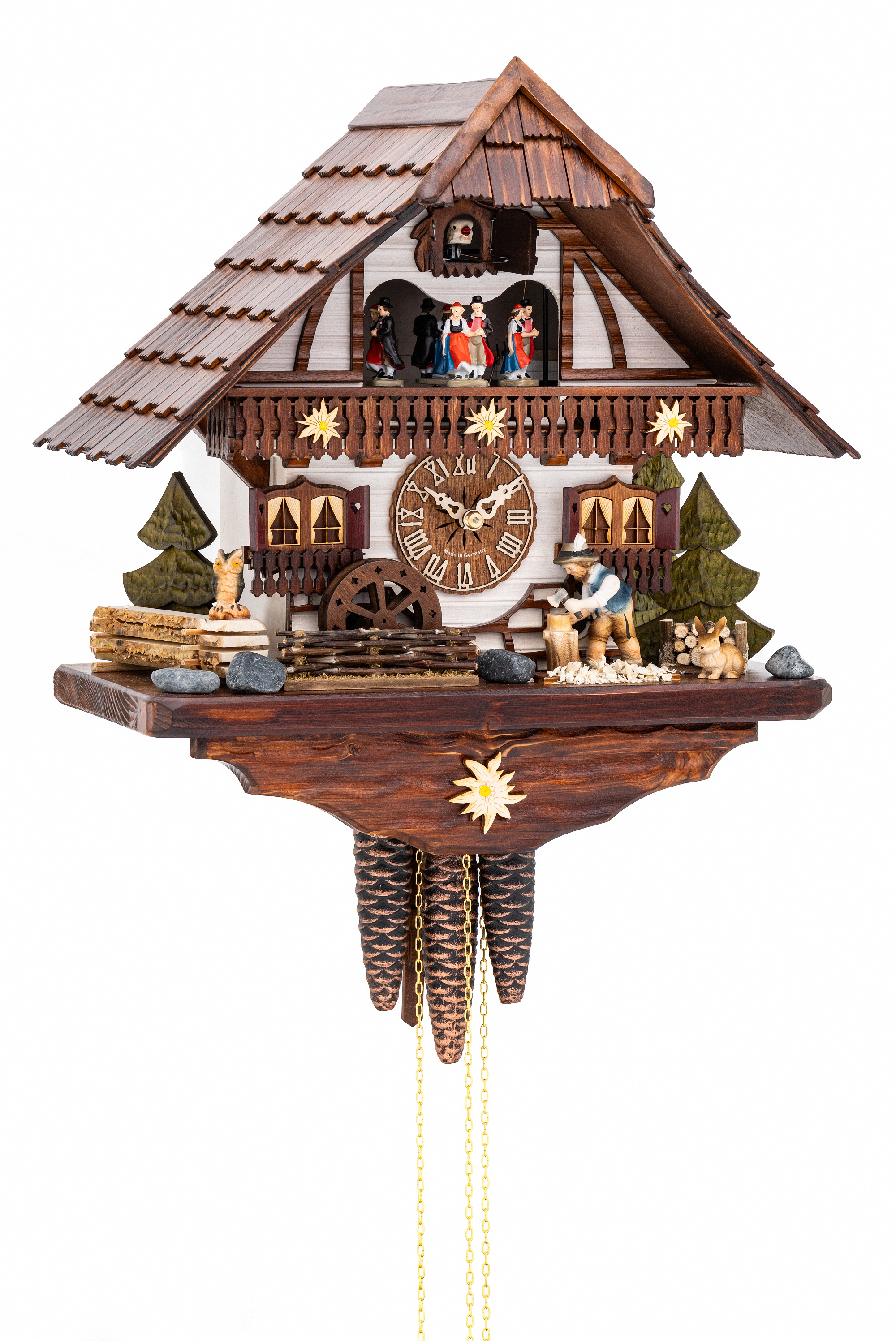 Cuckoo Clock Black Forest house with moving wood chopper and mill wheel NEW