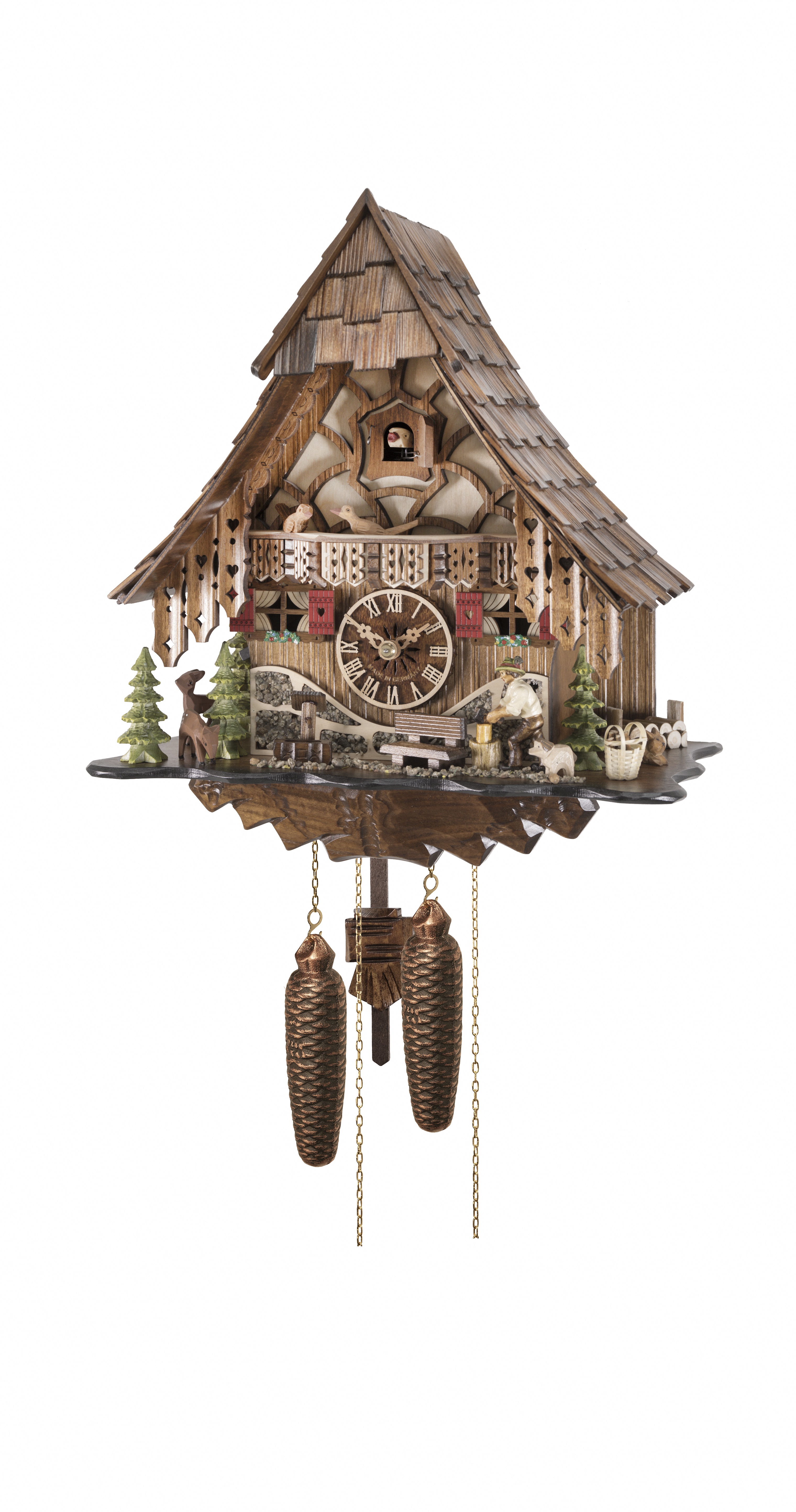 The cuckoo calls every half hour once and the number of the hours every full hour. This cuckoo clock has an exclusive life-like wooden handpainted cuckoo. With certificate of authenticity from the Black Forest Clock Association (VdS). It has a mechanical extreme long-life rack strike movement. It allows turning the hands left and right without endangering the mechanics of the movement. The 8 day running time movement need to be wind up once a week, that means you pull on the chains until the weights are up. The size refers only to the clock, without pendulum and weights.