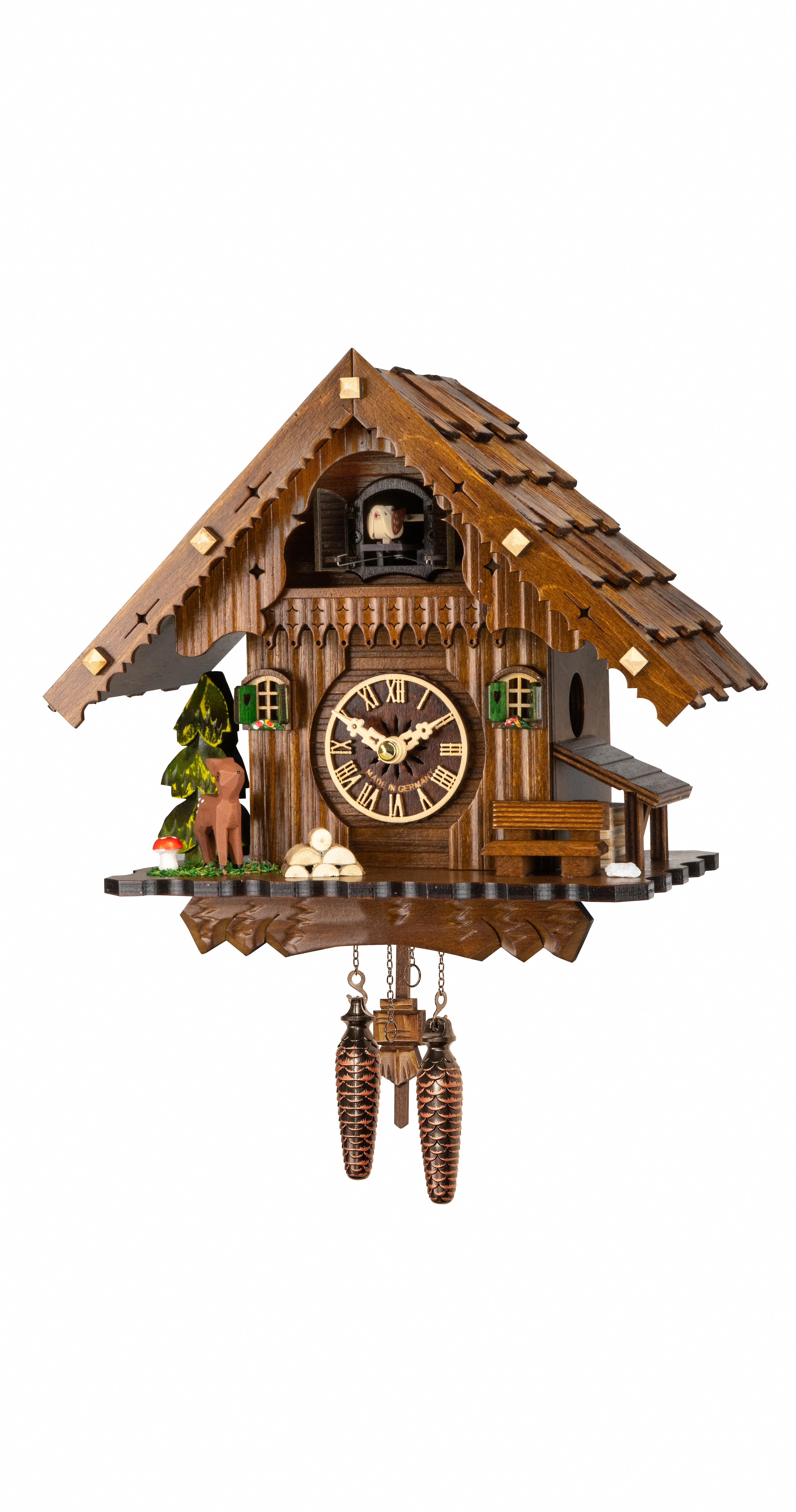 Cuckoo calls on the hour with echo. The clock has a battery operated movement with automatic night-off. The running-time of the batteries is about one year. The size refers only to the clock, without pendulum and weights. 2 years product warranty. The clock is made of wood.