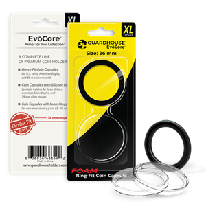 EvoCore ring-fit coin capsules accommodate coin sizes from 13 to 41 mm, including most foreign, early U.S., and odd-sized coins.