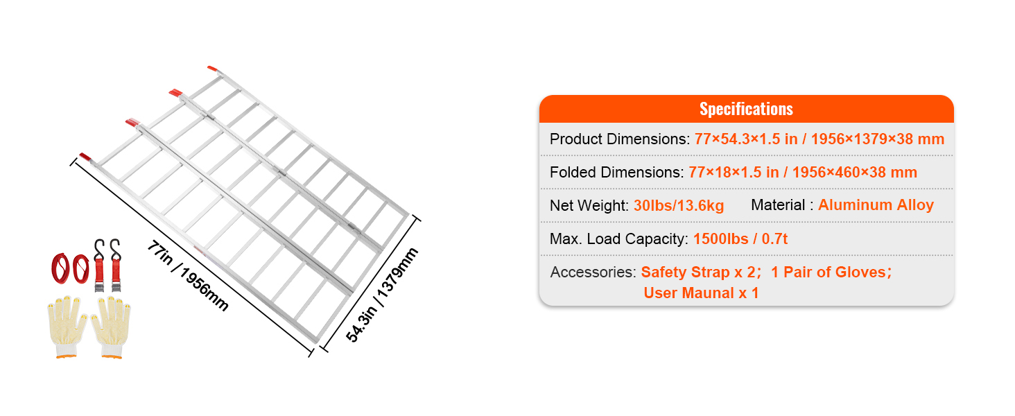 What type of vehicle is this ramp suitable for transportation? The bearing capacity of this ramp is 1500 lbs, which is more suitable for ATV, UTV, motorcycles, hand truck, bicycles and other vehicles. Please note: Do not exceed the weight capacity to prolong the ramp's lifespan. What are the specifications of the ramp? What's the maximum service height? Expanded size: 77" x 54.3" x 1.5"/1956 x 1379 x 38 mm. Folded size: 77" x 18" x 1.5"/1956 x 406 x 38 mm. Claw plate size: 3.4” ×1.1“/86×27 mm. Length of strap: 74.8"/190 cm. Recommended height: 20"/50 cm. Maximum service height: 28.3"/72 cm. What's in the package? The ramp kit includes 1 x straight ramp, 2 x safety straps with hook, 1 pair of gloves, 1 x instruction.