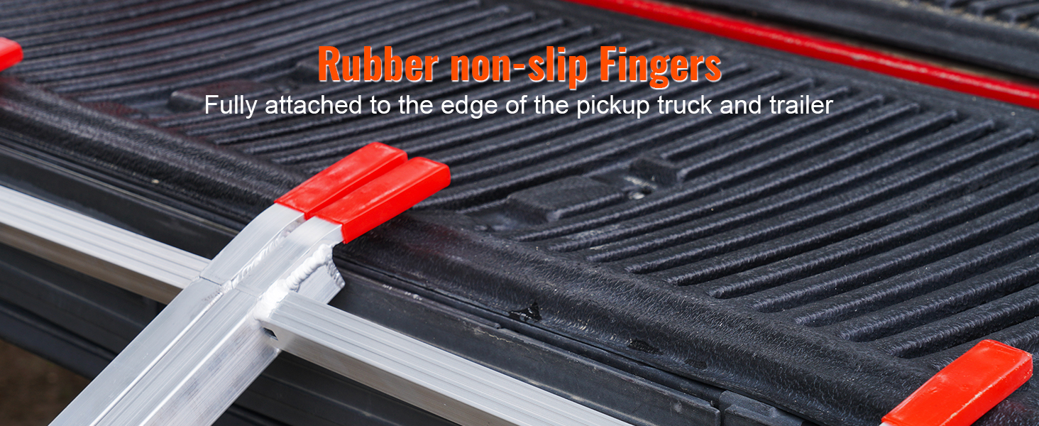 - High Security: Equipped with rubber-tipped fingers and safety straps to ensure the ramp stays securely fastened to your pickup truck or trailer. You can rest easy knowing your vehicles are safe and secure during transport.