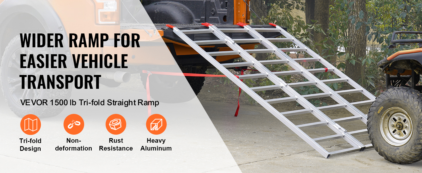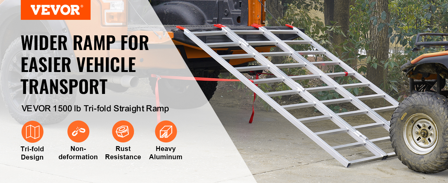 The three-fold 1500 LBS/0.7 Tons straight ramp provides a more spacious transportation area. It is a great choice for vehicle transportation. The ramp can be folded to 18 inches in width, which is convenient for storage.