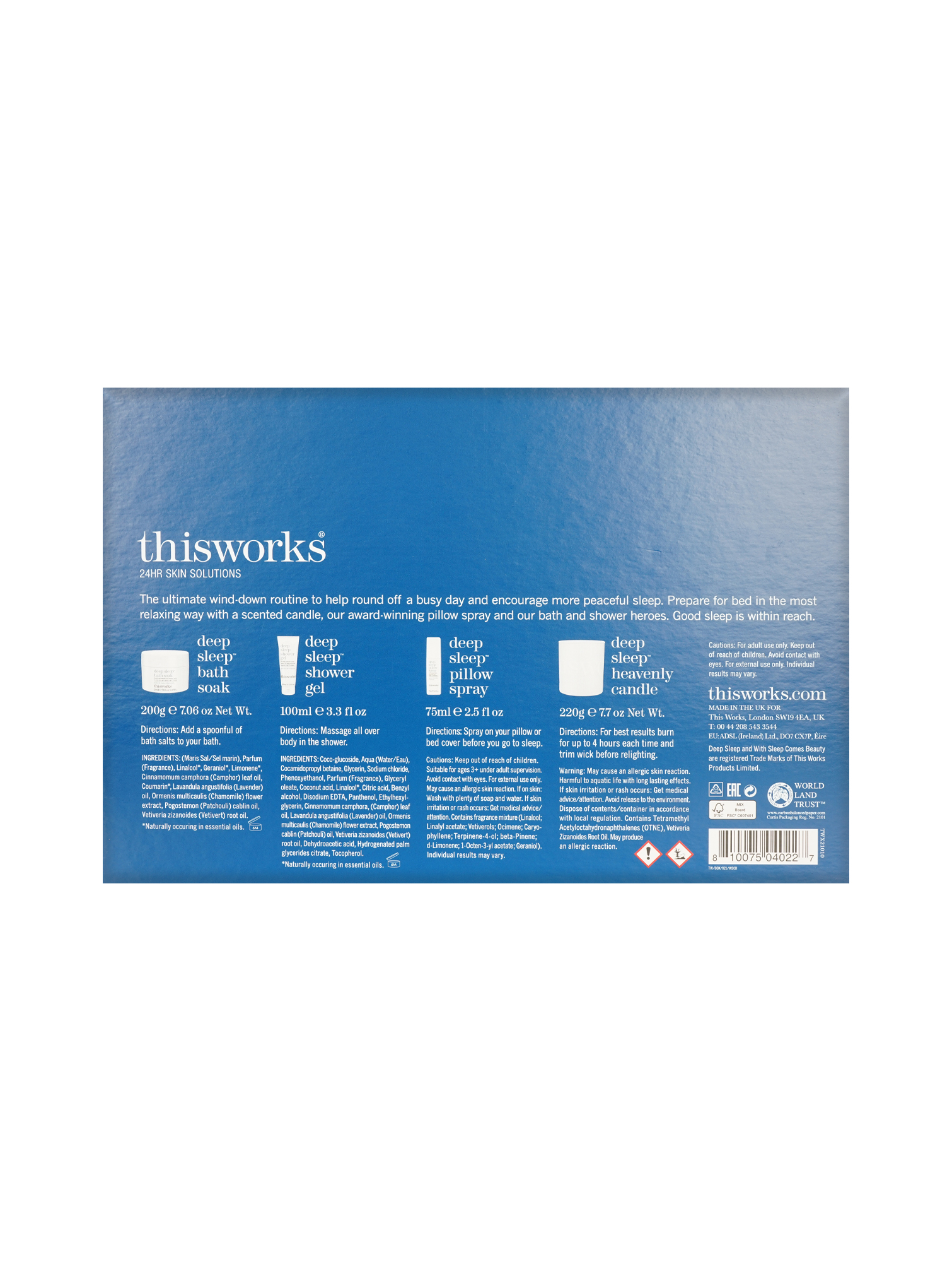 ThisWorks With Sleep Comes Beauty is your go to set for a restful and Zen sleep each night. Included in this set are Deep Sleep Bath Soak 7.06 oz, Deep Sleep Bath Soak 7.06 oz, Deep Sleep Shower Gel 3.3 oz and Deep Sleep Heavenly Candle 7.7 oz. This set is designed to help restore healthy sleep patterns, particularly for restless sleepers. It features a slow release, motion activated system that continuously releases a soothing aroma throughout the night, ensuring longer and less disturbed sleep. The spray is formulated with 99% natural ingredients, including encapsulated Lavender, Camomile, and Vetivert essential oils, known for their calming and sleep inducing properties. How to use: To use, simply mist the spray over your pillow, bed linens, or pajamas before bedtime. The product is cruelty free and vegan, making it a conscientious choice for those looking to improve their sleep naturally. Use each product as directed in box.