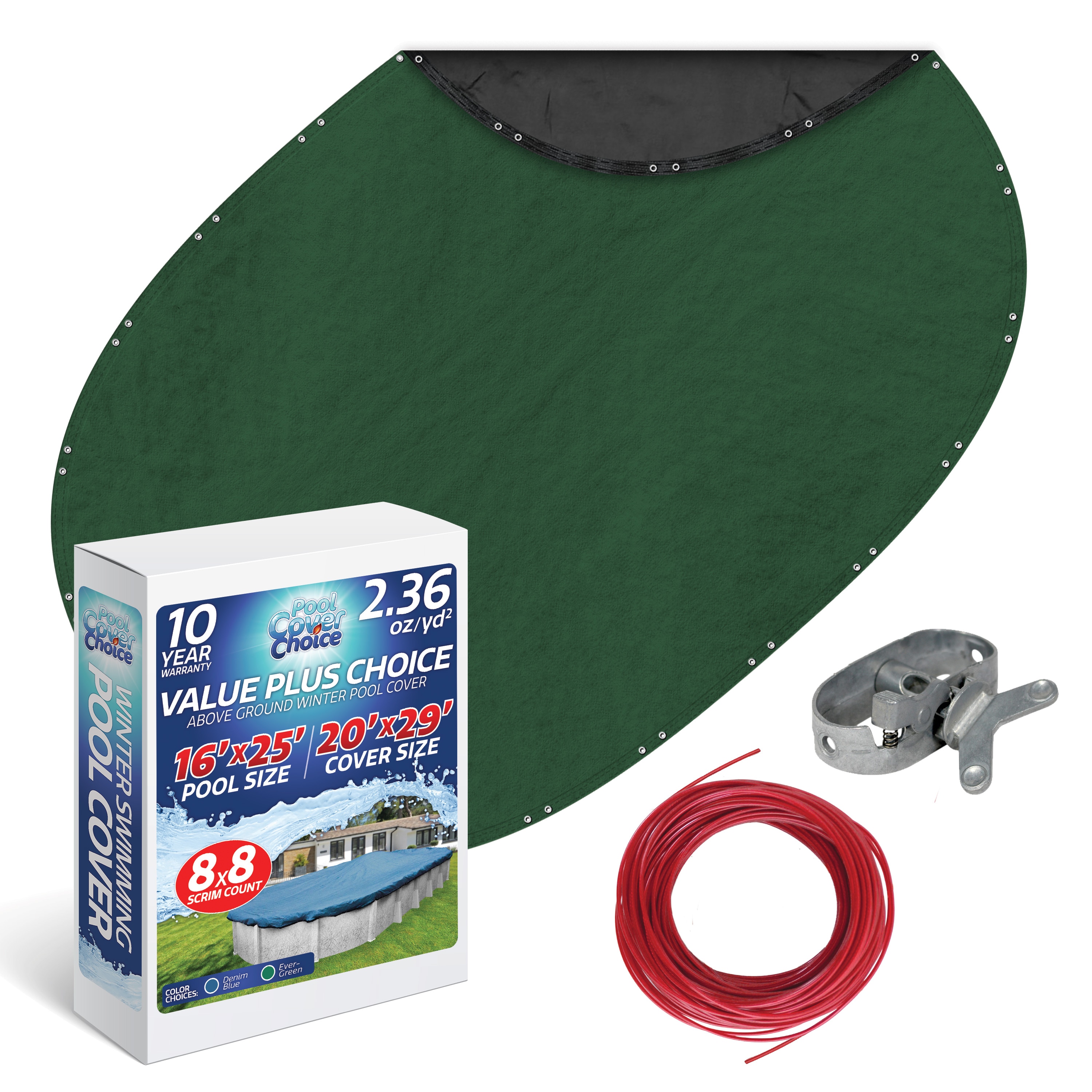 WINTER PROTECTION. Value Plus Choice cover series is the perfect choice for providing protection against sun, snow, ice and wind for your in- ground swimming pool in areas of the country with harsh winter conditions and inclement weather. This solid cover is crafted from a woven, laminated polyethylene material that keeps dirt, leaves, and branches from decaying in your pool all winter. Every Pool Cover Choice winter cover is treated to protect it from sunlight degradation. For additional protection, each cover has the thickest black underside coating in the industry. SPECIFICATIONS- This oval cover fits a 16 ft x 25 ft pool size and the overall total dimension of the cover is 20 ft x 29 ft which includes a 4’ overlap. The scrim count (the number of fibers used per square inch in the fabric's weave) is 8 X 8 with a material weight of 2.36 oz/yd2. These specs give this cover extra strength and durability. For additional protection, each cover has the thickest black underside coating in the industry. EASY TO INSTALL & SECURE - This cover features a 4-foot overlap (extra material beyond pool size), making the cover easier to install. Secure the vinyl-coated steel-core cable through the reinforced metal grommets and tighten with the specially molded metal winch. The winch turns smoothly making it easy to tighten the cable securing your cover in place. BUYING TIPS: When ordering be sure to order by your actual pool size. The pool size should be measured from inside wall to inside wall in both the width and length for oval shaped pools or diameter for round shaped pools. For pools with an extra-large top rail of 10� or more please order the next size up. Ice equalizer pillow sold separately. 10-YEAR WARRANTY – Value Plus Choice cover series comes with a 10-year pro-rated warranty.