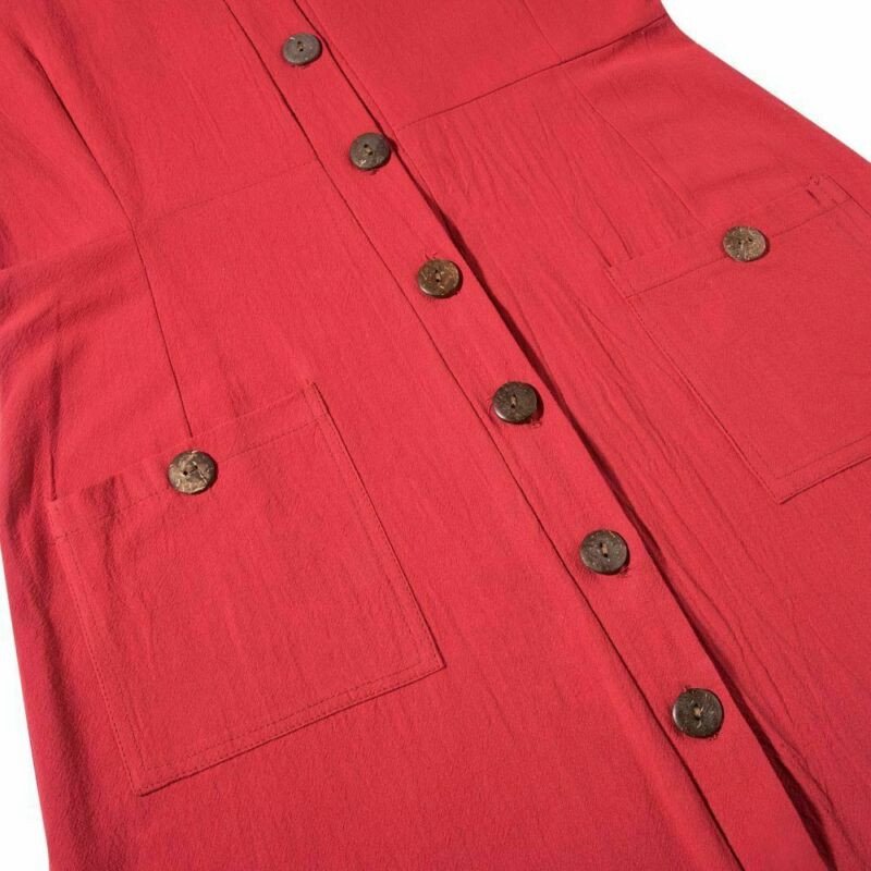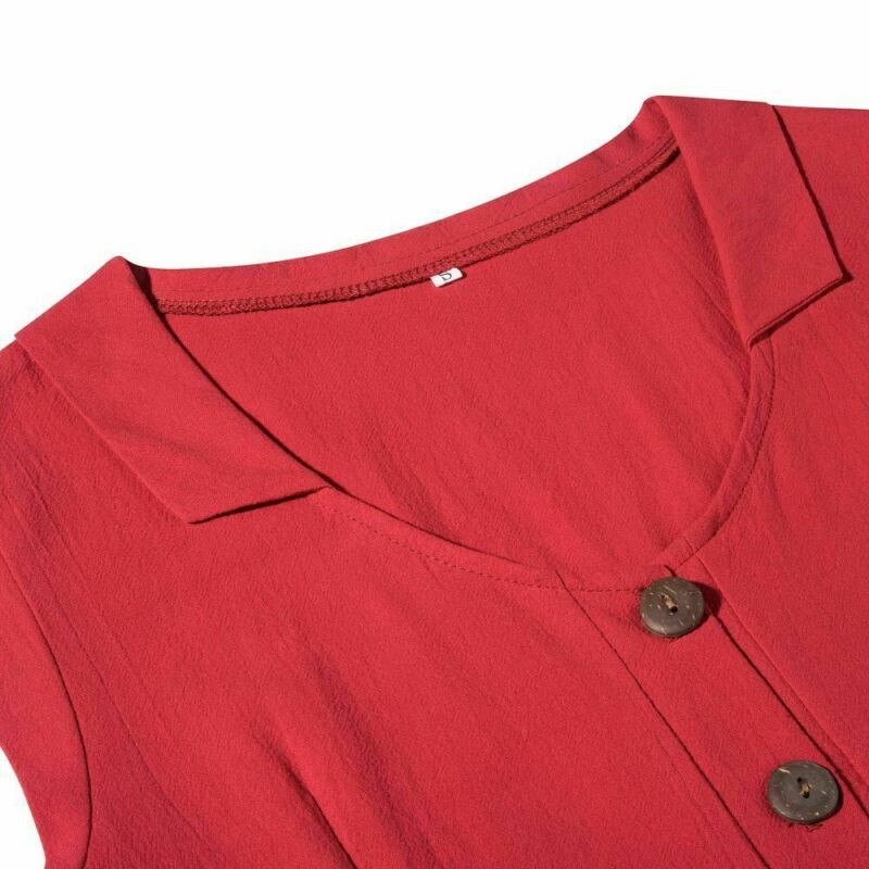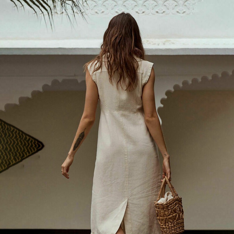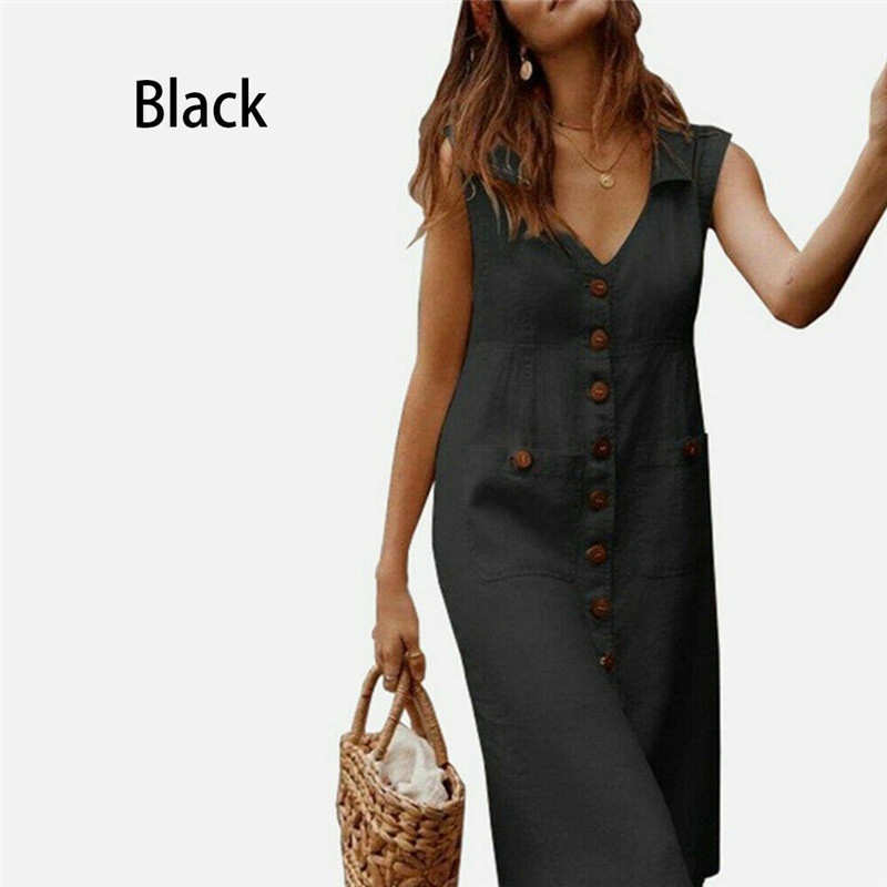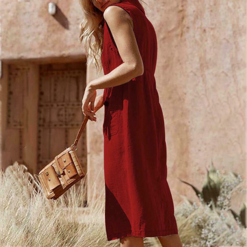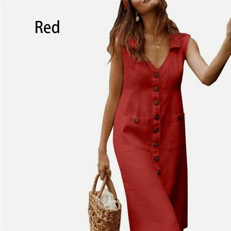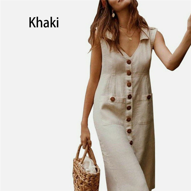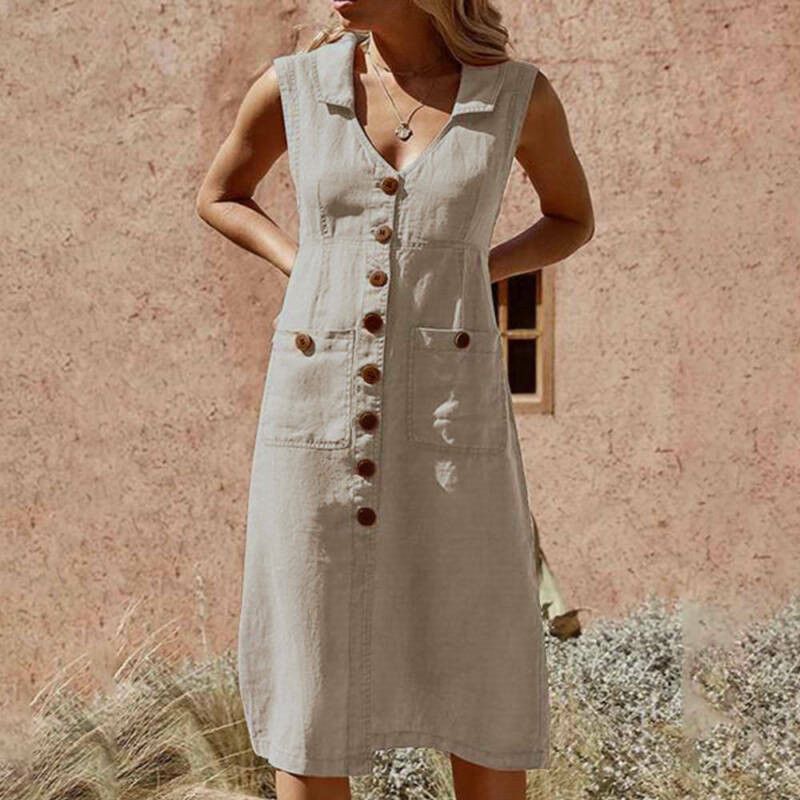 Women Boho Ladies V Neck Midi Dress with Pocket Summer Dress Cotton Linen