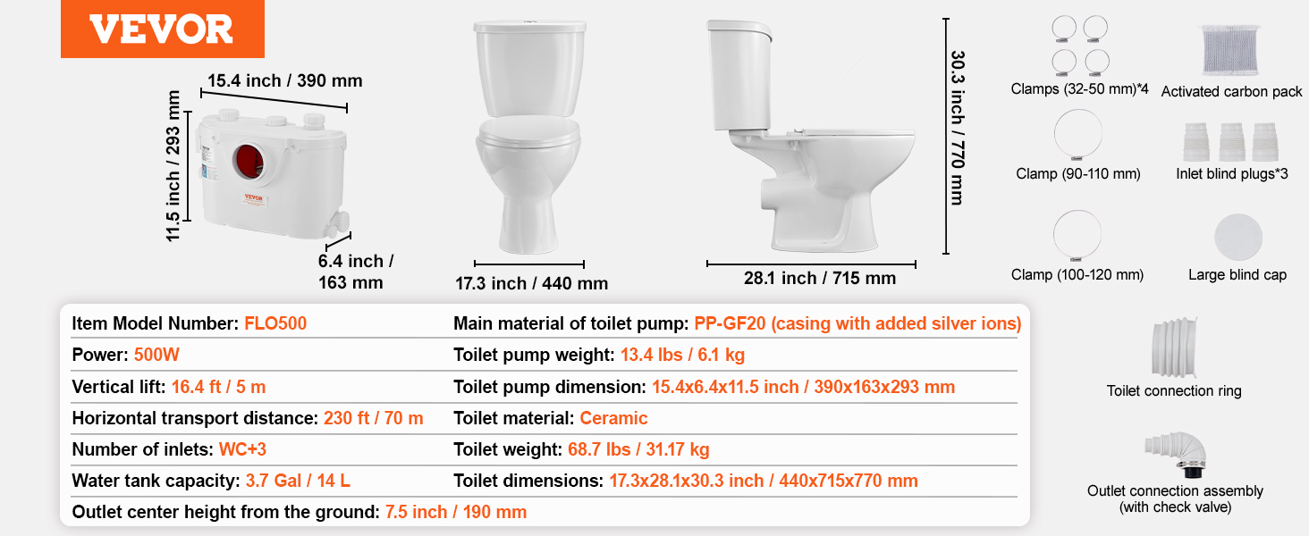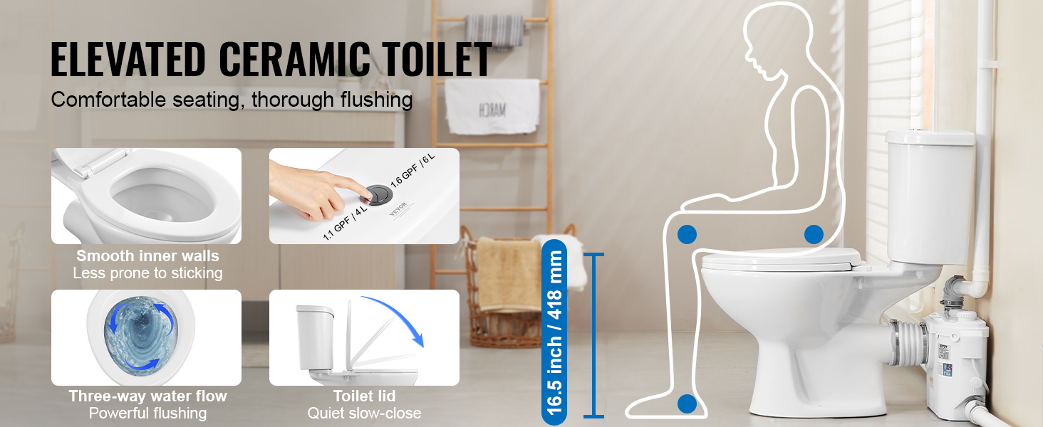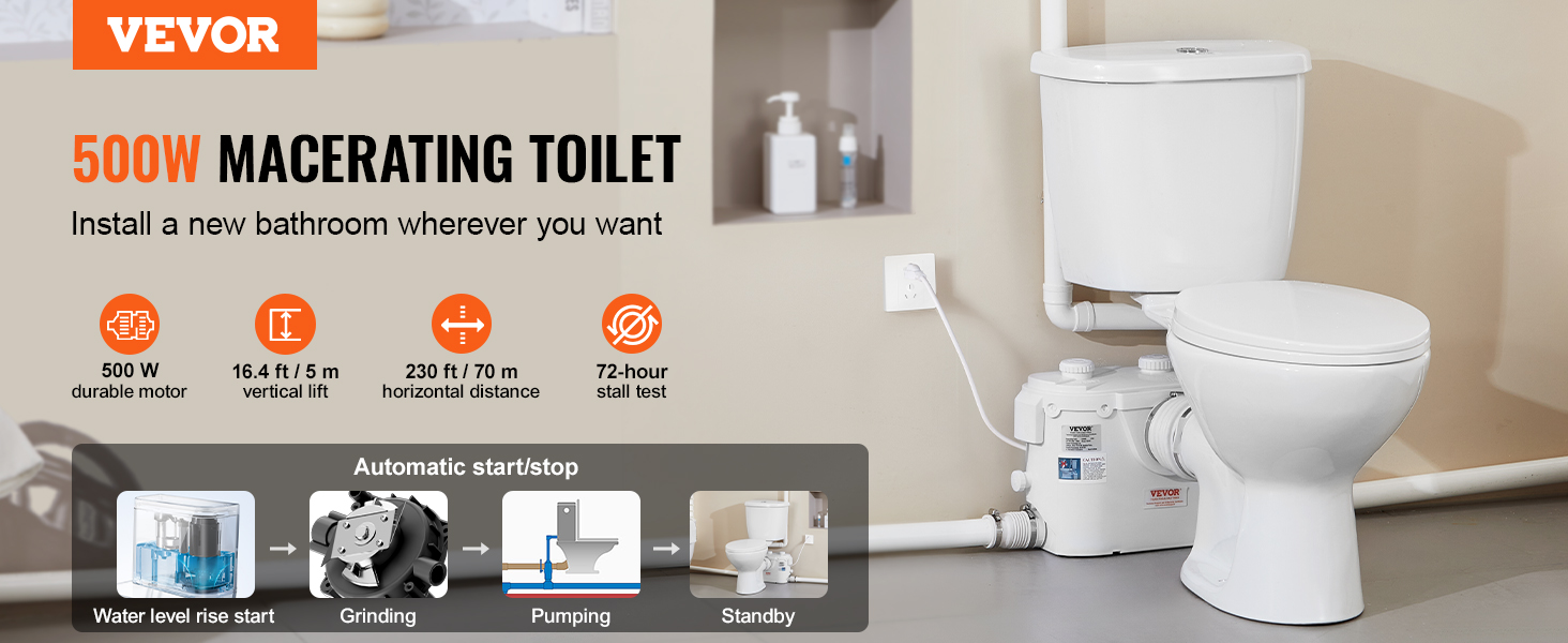 Powerful Transportation Power: Designed specifically for homes without pre-set drainage pipes, this macerating toilet system features a durable 500W motor that provides excellent power for sewage extraction and transportation. This upflush sewage system achieves a vertical lift of 16.4 ft / 5 m and a horizontal transport distance of 230 ft / 70 m, making it ideal for adding a toilet in basements, garages, balconies, and other areas, ensuring efficient waste management.