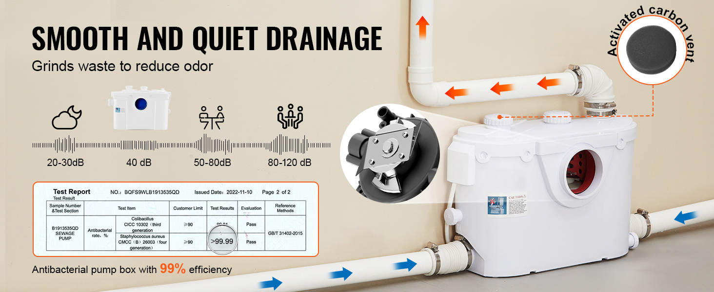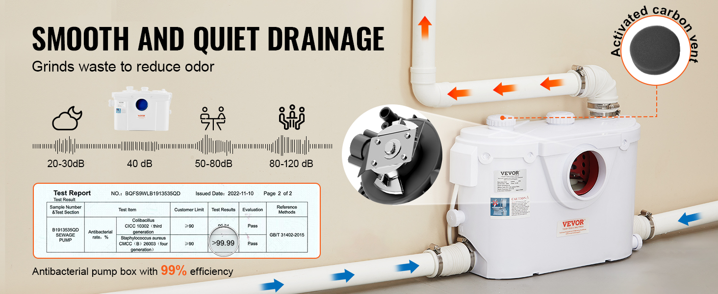 The built-in sharp blades grind wastewater, waste, and hair into small particles, ensuring a smoother water flow system without clogging. The noise generated during the process is low enough not to disturb normal sleep.