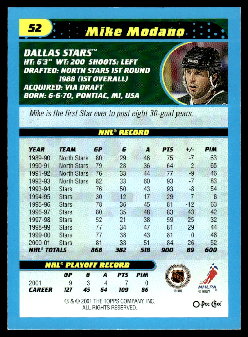 | 2001-02 Topps O-Pee-Chee RETRO Mike Modano Dallas Stars #52 | ||||||||||||||||