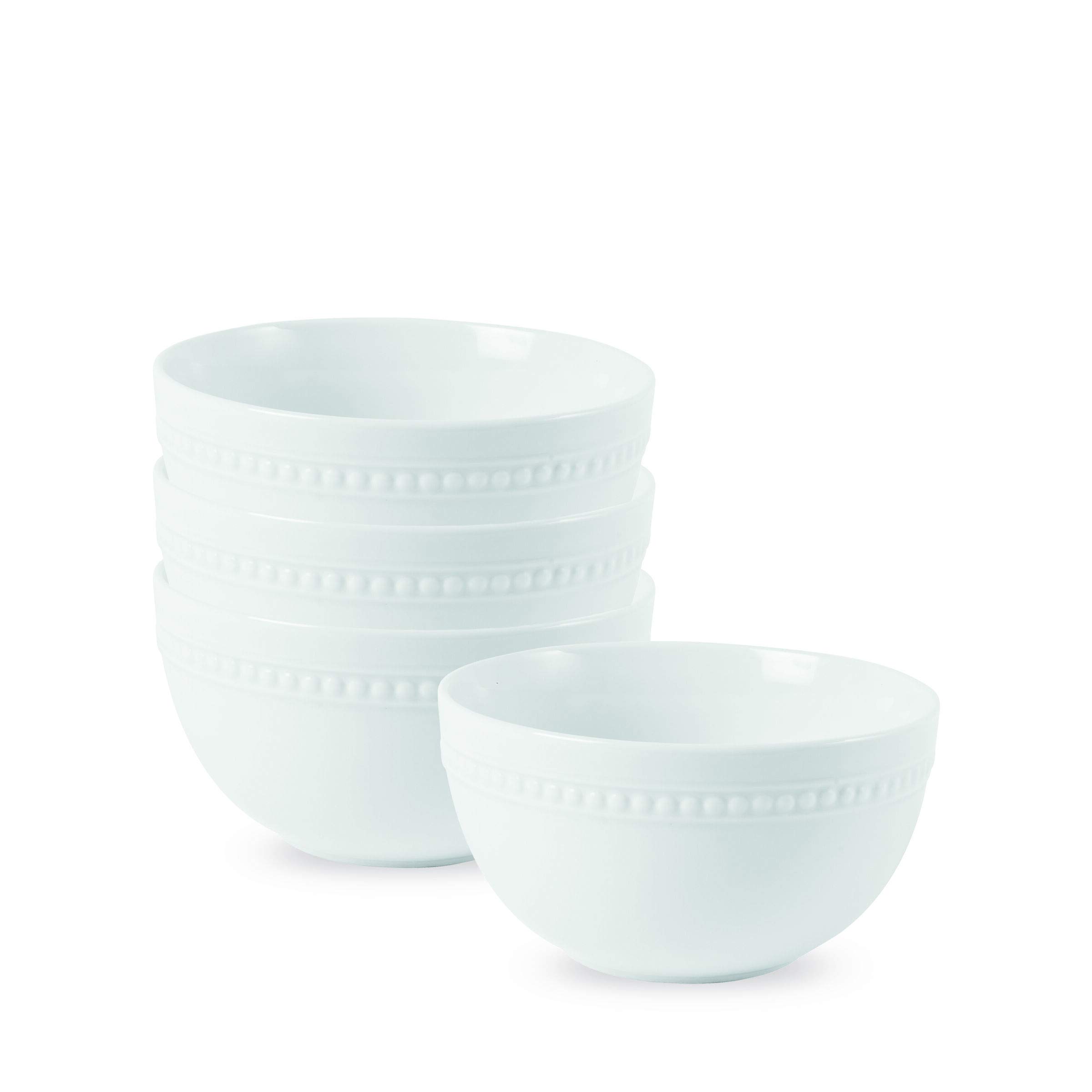 Elegant and understated, this Set of 4 Everyday White Beaded Bowls by Fitz and Floyd is beautifully crafted of chic white porcelain bordered with a subtle, raised bead pattern. Perfect for everyday use or formal entertaining and will match any home decor. Set of 4 bowls, each measuring 5-1/2 inches in diameter by 3 inches high with a 26-fluid ounce capacity. Dishwasher, microwave and oven safe up to 450 degrees.