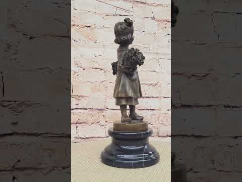 The signed Daste bronze sculpture features a charming portrayal of a young girl carrying a basket of flowers, capturing a moment of innocence and beauty. Handcrafted using the lost wax method, this figurine showcases exquisite details and craftsmanship, highlighting the delicate features of the girl and the intricacies of the flowers in her basket.