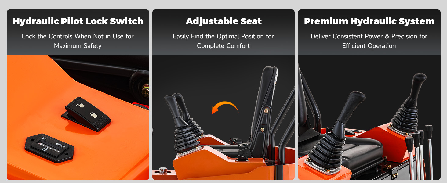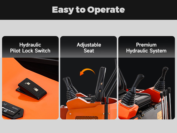 Safe & Easy Operation: This digger features user-friendly joysticks for operators of all skill levels, while its hydraulic pilot lock switch securely locks the hydraulic system when not in use, preventing accidental drops and enhancing safety.