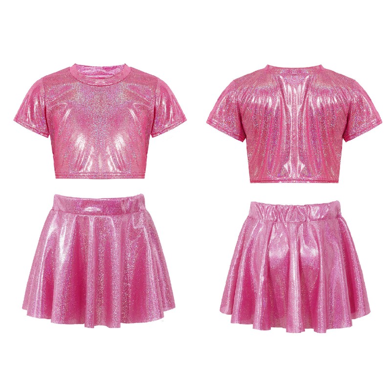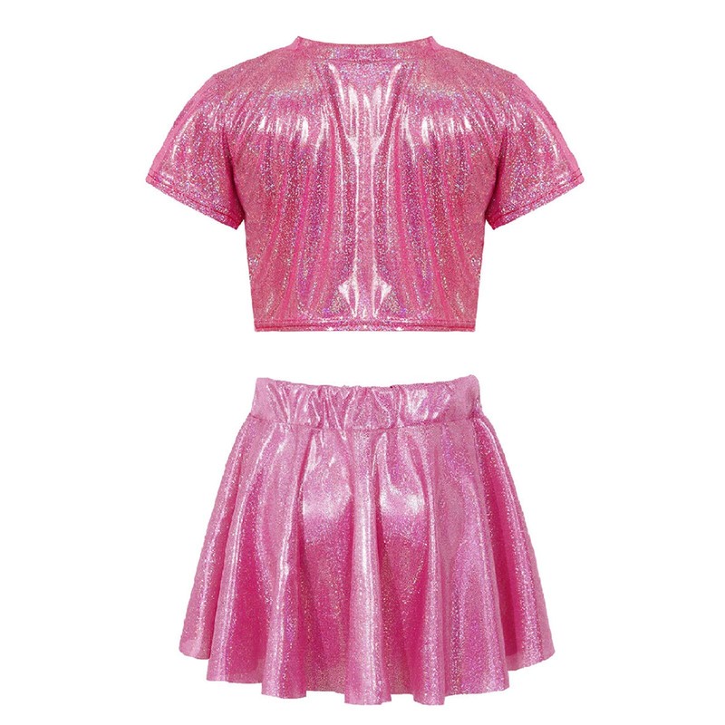 Girls Glittering Short Sleeve Crop Top with Skirt for Performance Dance.