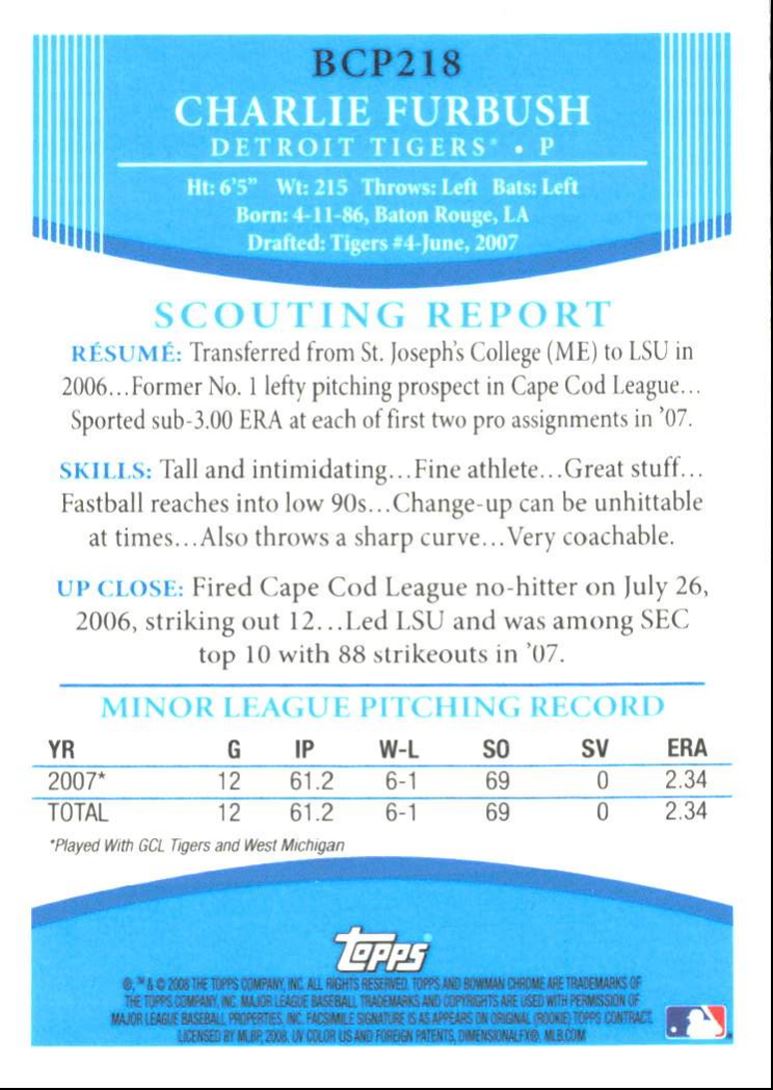 | 2008 Bowman Chrome Prospects Charlie Furbush Detroit Tigers #BCP218 |