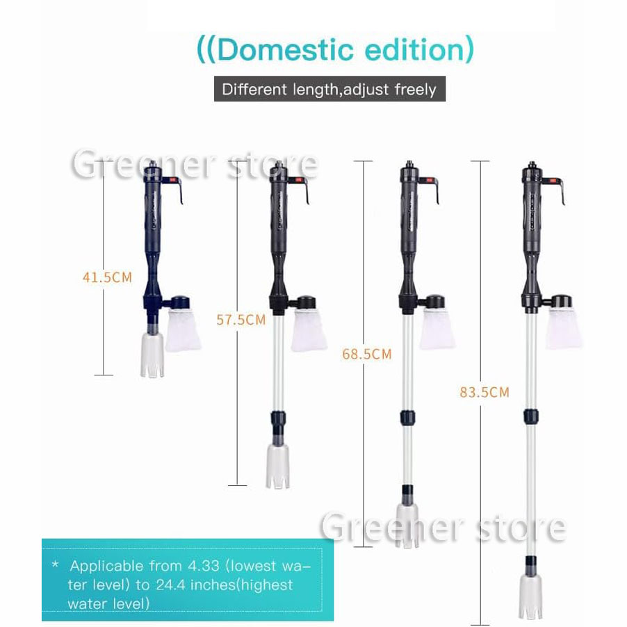 **ADJUSTABLE LENGTH DESIGN: Gravel cleaner uses an adjustable telescopic pole. The length can be adjusted flexibly, the shortest is 17.12in to the longest is 32.87in. You can adjust the length according to the size of your fish tank or water level. It makes fish tank cleaning easier and is a good and indispensable partner in your daily life.