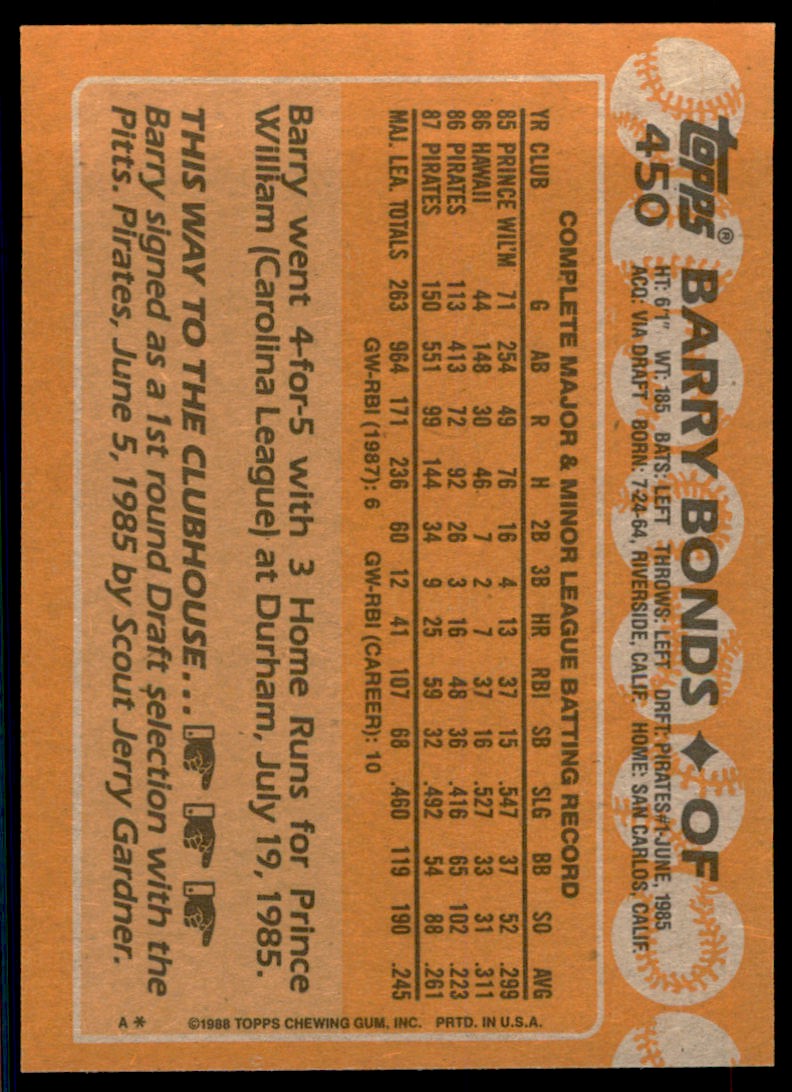 | 1988 Topps. Barry Bonds Baseball Cards #450 |