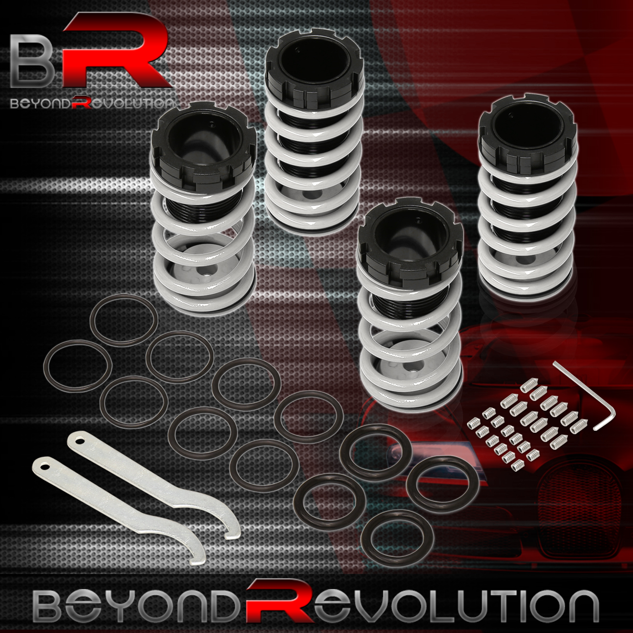 - Full ride height adjustable lowering spring coilover sleeves kit.
