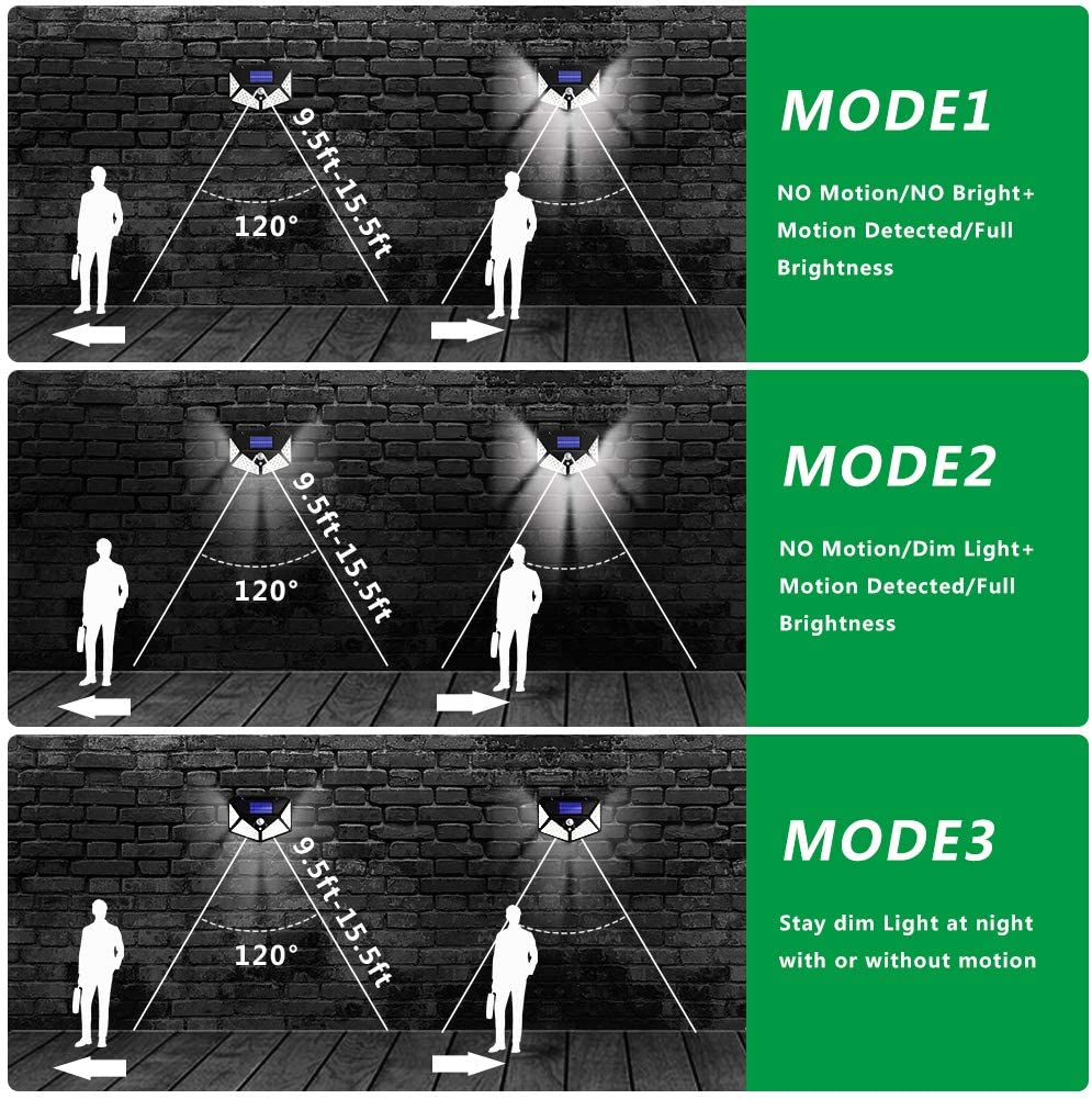 3 Lighting Modes: Switch ON/OFF key to change different modes - Mode 1: Automatically turn on when motion detected and turn off after lighting on around 15 seconds. Mode 2: Always turn on under darkness condition, it become brighter when motion detected objects. Mode 3: Always turn on under darkness condition by 50W bright lighting.