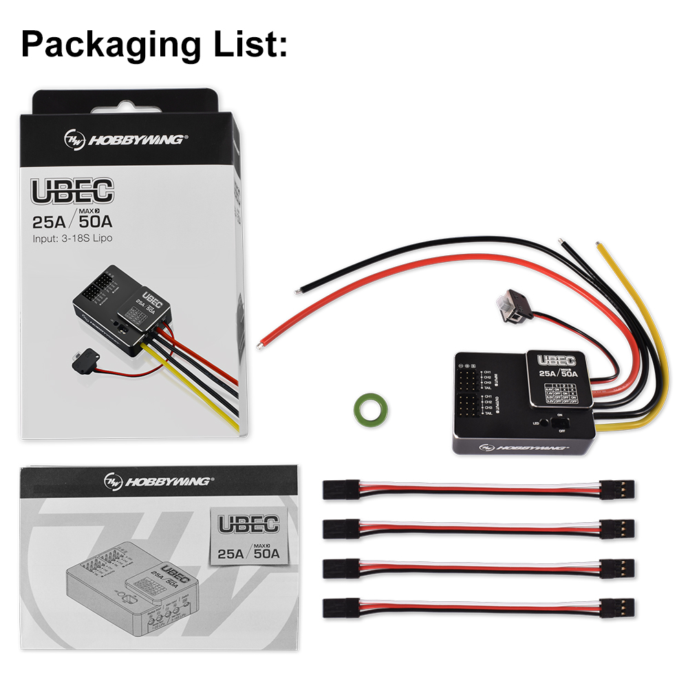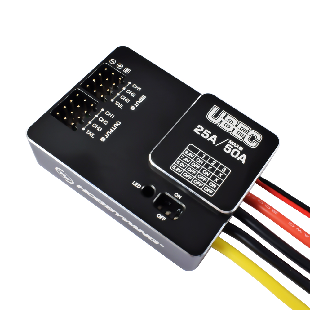 The UBEC is an external switching-mode DC-DC regulator chip. lt draws the DC voltage from a 3-18S LiPo battery and drops the voltage to a level suitable for receivers and other electronic devices and keeps providing the stable current output of up to 25Amp.It is particularly applicable for thelarge helicopters or fixed-wing aircraft which use several servos.