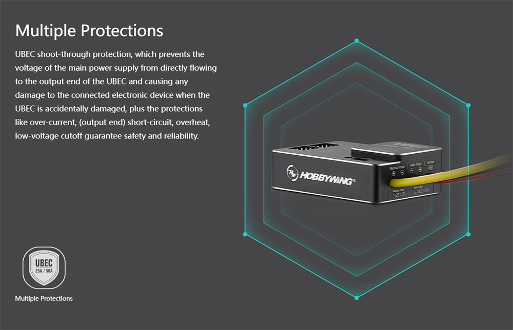4. BEC shot-through protection prevents the input voltage of the main powe suply from directly flowing to the output end of the UBEC and damaging the electronic devices connecting to the output end when the UBEC is accidentally damaged.