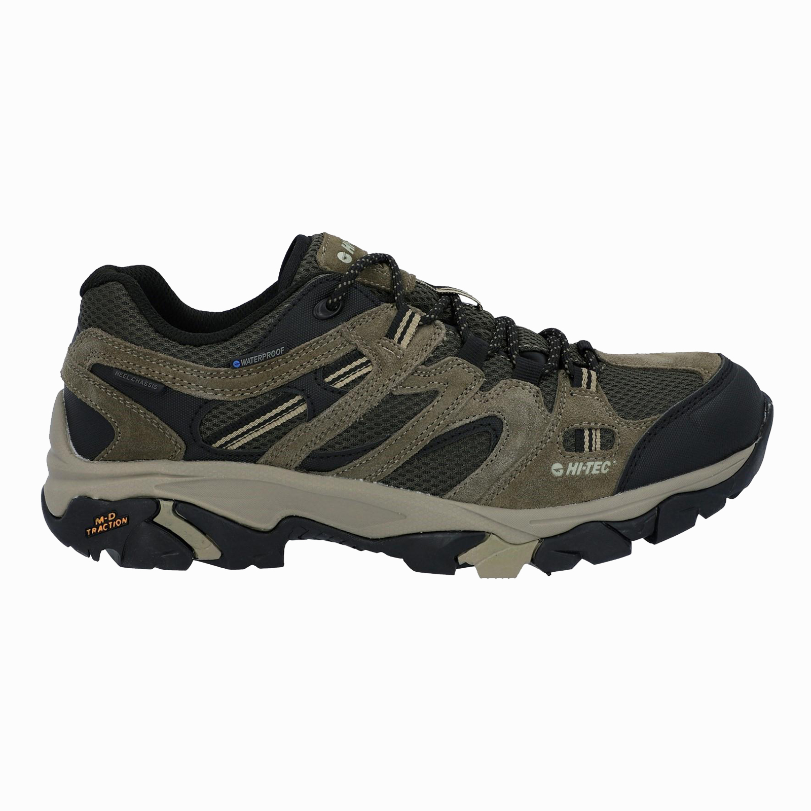 Experience unparalleled comfort and versatility with our fully waterproof, multi-activity footwear designed for all terrains. The polyester textile upper with suede trims and breathable mesh underlay combines durability with style. Equipped with a Dri-Tec waterproof, breathable membrane, your feet stay dry and comfortable in any environment. The padded collar and tongue, along with a gusseted tongue, enhance comfort and keep debris out. A ghillie and rustproof hardware lacing system ensures a secure fit, while the soft mesh lining offers instant comfort. The removable, contoured Ortholite footbed delivers exceptional underfoot cushioning, complemented by a compression-moulded EVA midsole for added support. A lightweight, durable fork shank provides stability and flexibility, and the M-D Traction outsole guarantees reliable grip whether walking uphill or downhill