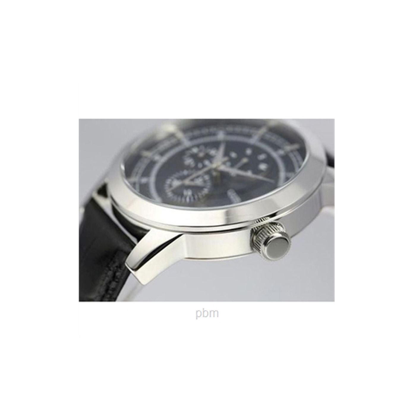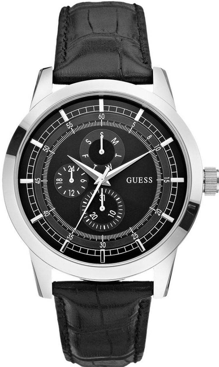 Guess multi function mens watch. A quality look to the watch that has a slightly aeronautical style to it with the minute and tiny second markers on the inner dial. Three sub dials for the day, date and hour in 24 hour format. A silver tone bezel complimented nicely by the silver tone hands and the look is completed with the black leather strap. Large case size at approx 46mm and a water resistance of 3ATM.