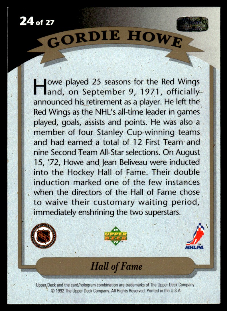 | 1992-93 Upper Deck Hockey Heroes Gordie Howe Detroit Red Wings #24 | ||||||||||||||||