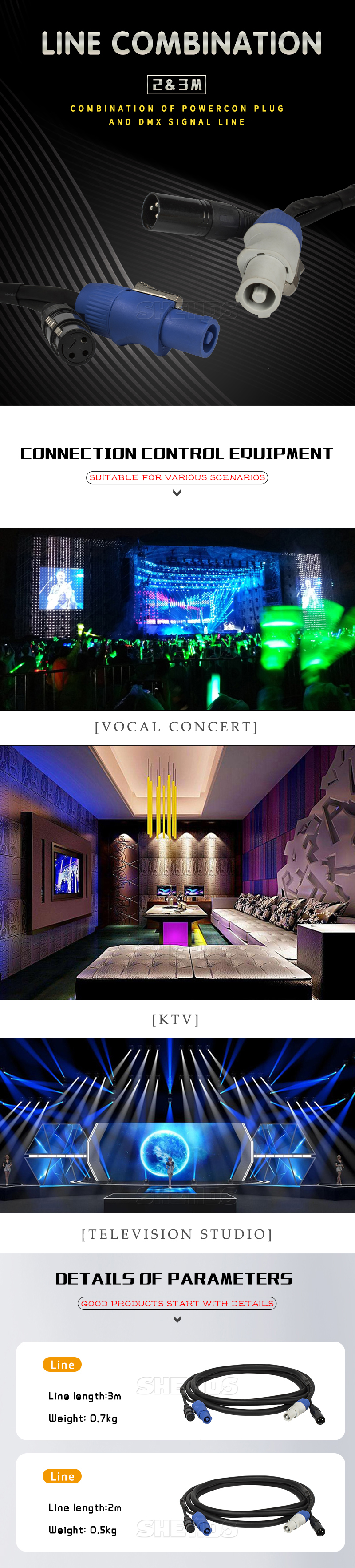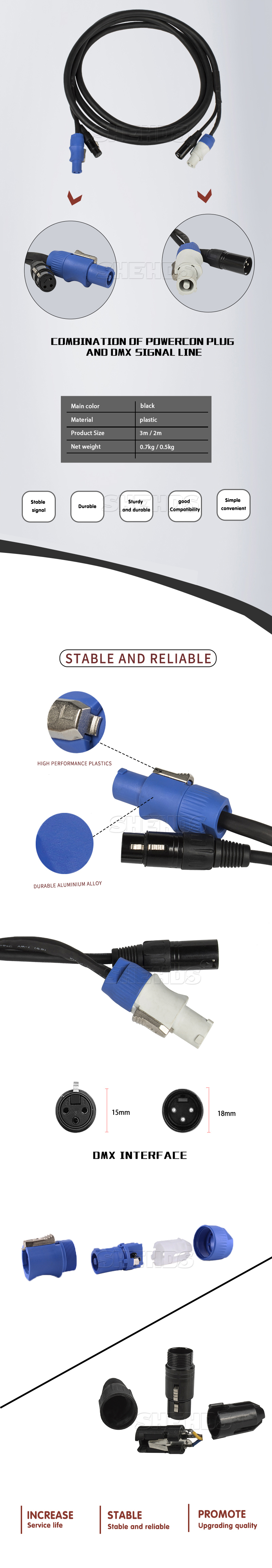 * Product Name: Combination Of Powercon Plug And * DMX Signal Line * Main Color: Black * Material: Plastic * Lengh: 3 meters * Weight: 0.7KG * Occasion: Professional Stage & DJ * Style: DMX Stage Light * Item Type: Stage Lighting Effect