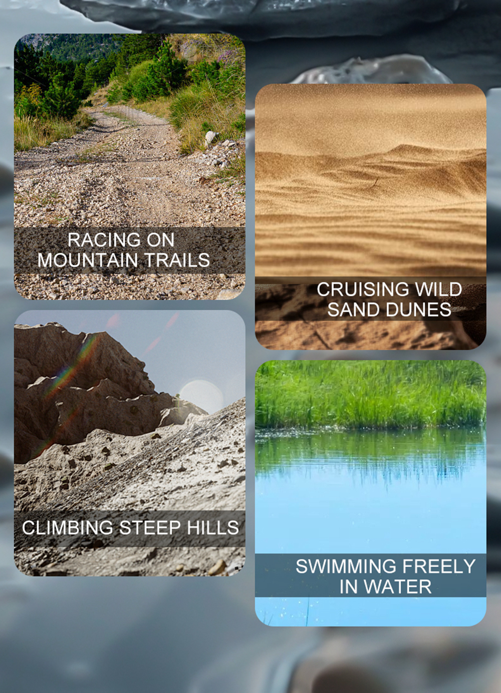 8. For racing onmountain trails,cruising wildsand dunes,climbing steep hills,swimming freely in water