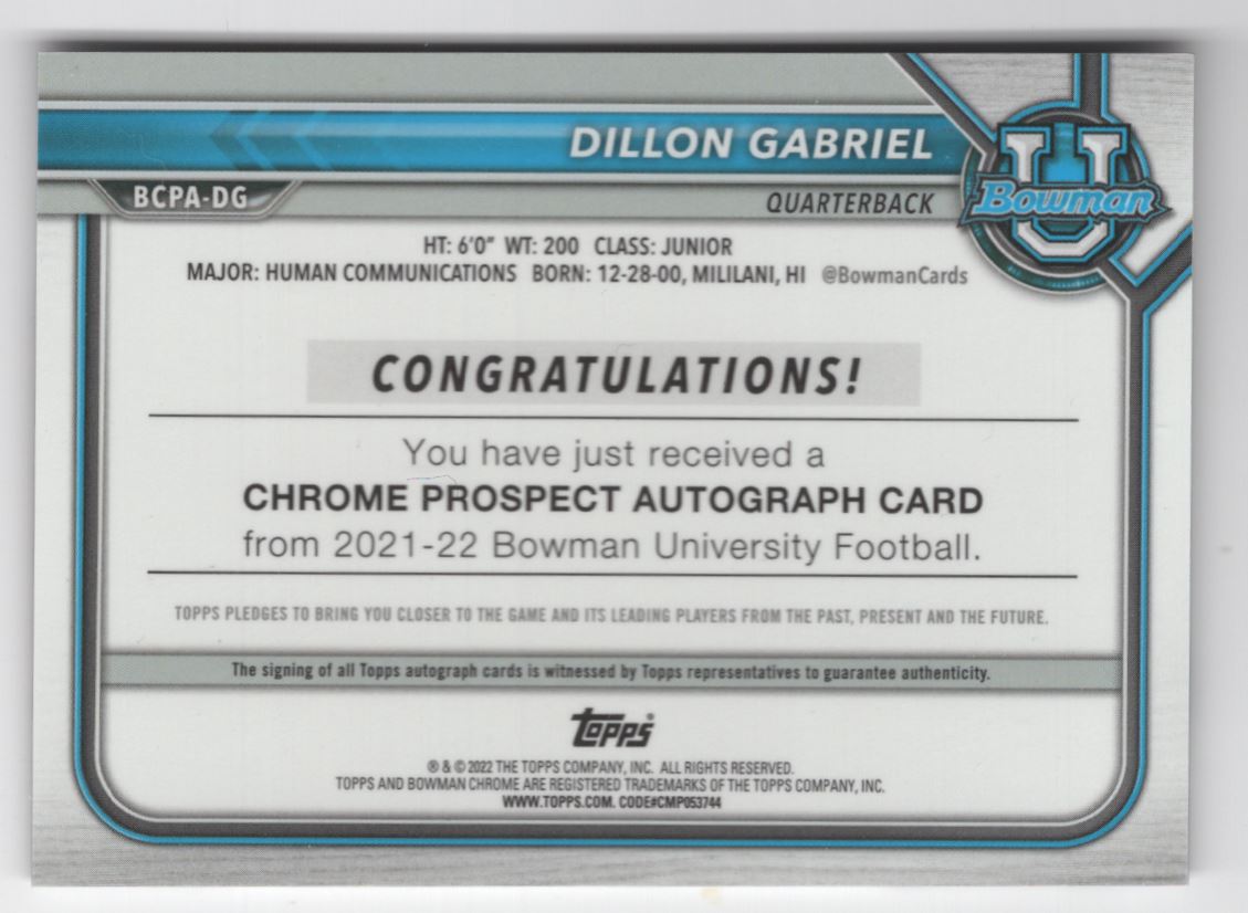 | 2022 BOWMAN CHROME UNIVERSITY LAVA AUTO Dillon Gabriel Auto 150/199 Oklahoma | ||||||||||||||||||||