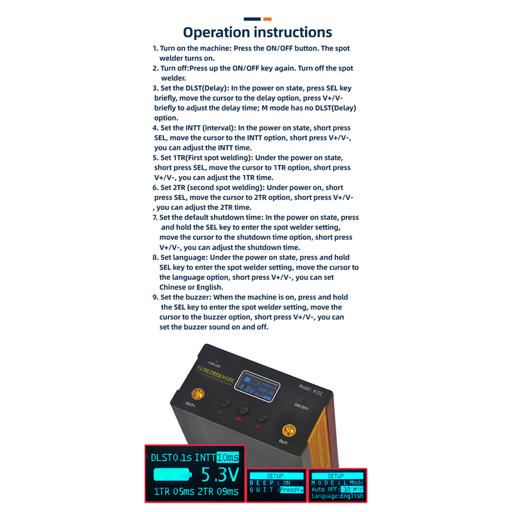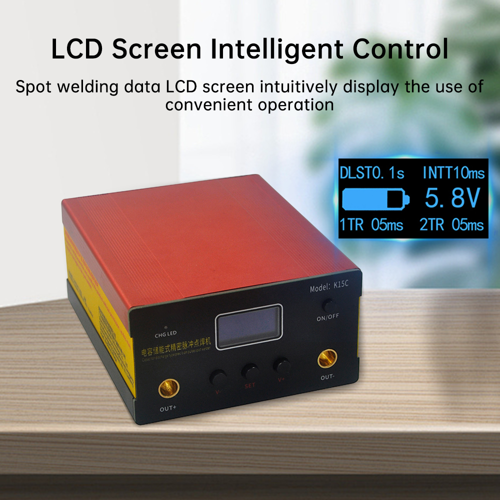 Features 1.LCD screen display intelligent control: spot welding data LCD liquid crystal screen intuitive display easy to use and quick to operate 2. Single and double pulse: high-power spot welding Easy continuous spot welding 0.15mm nickel-plated sheet 3. Portable and compact: portable, compact and convenient, without assembly 4.MOS tube: low internal resistance MOS tube, the theory can fully explore the performance of the capacitor 5. Super Farad Capacitor: good capacitance quality, long life, no charging maintenance! 6. Multi-function settings: spot welding settings in English and Chinese settings default shutdown time settings buzzer switch settings and so on. 7.Automatic spot welding: automatic trigger spot welding without extra steps, greatly enhance the efficiency of spot welding!