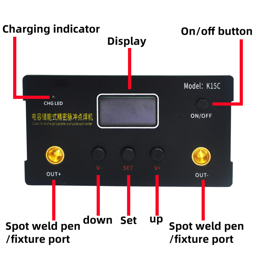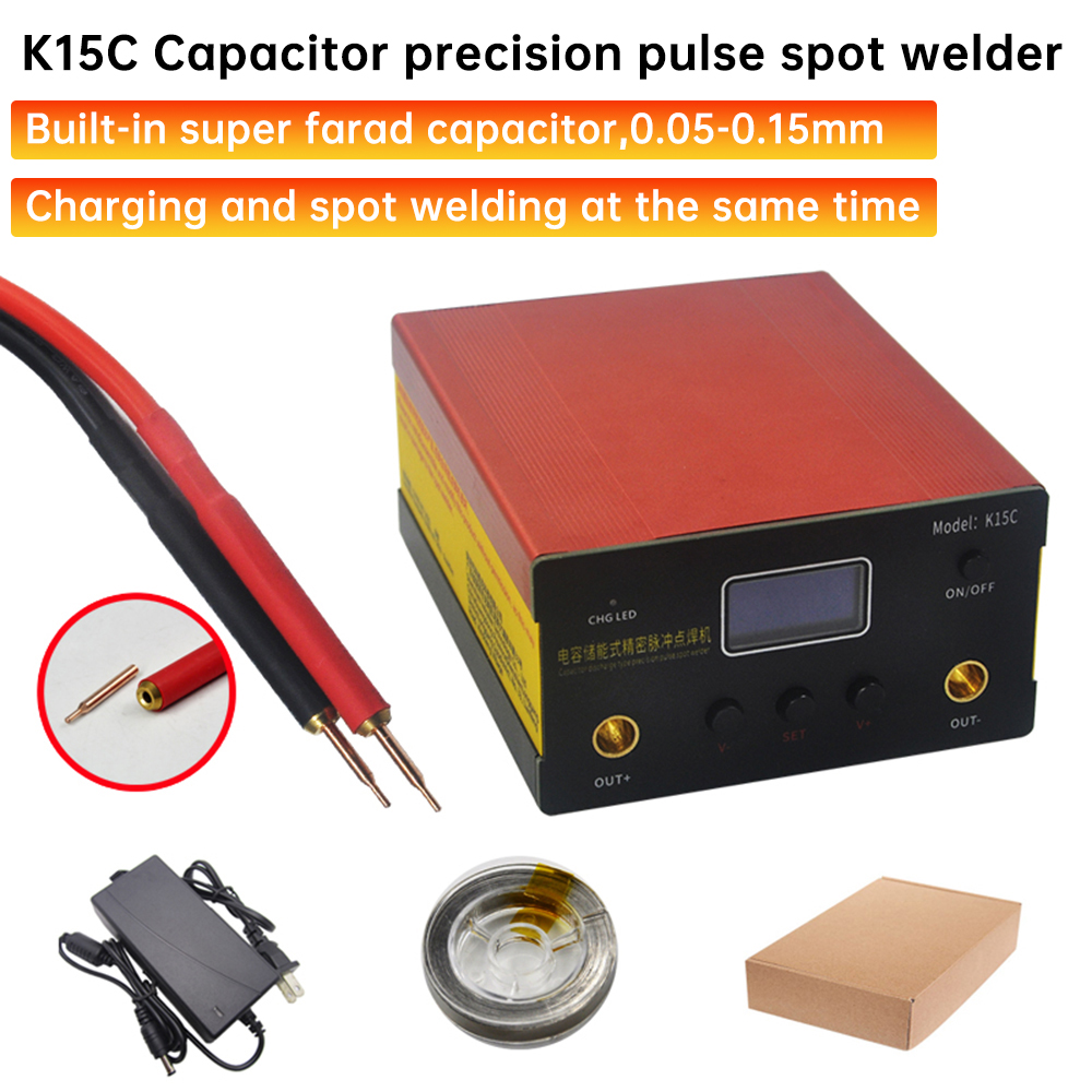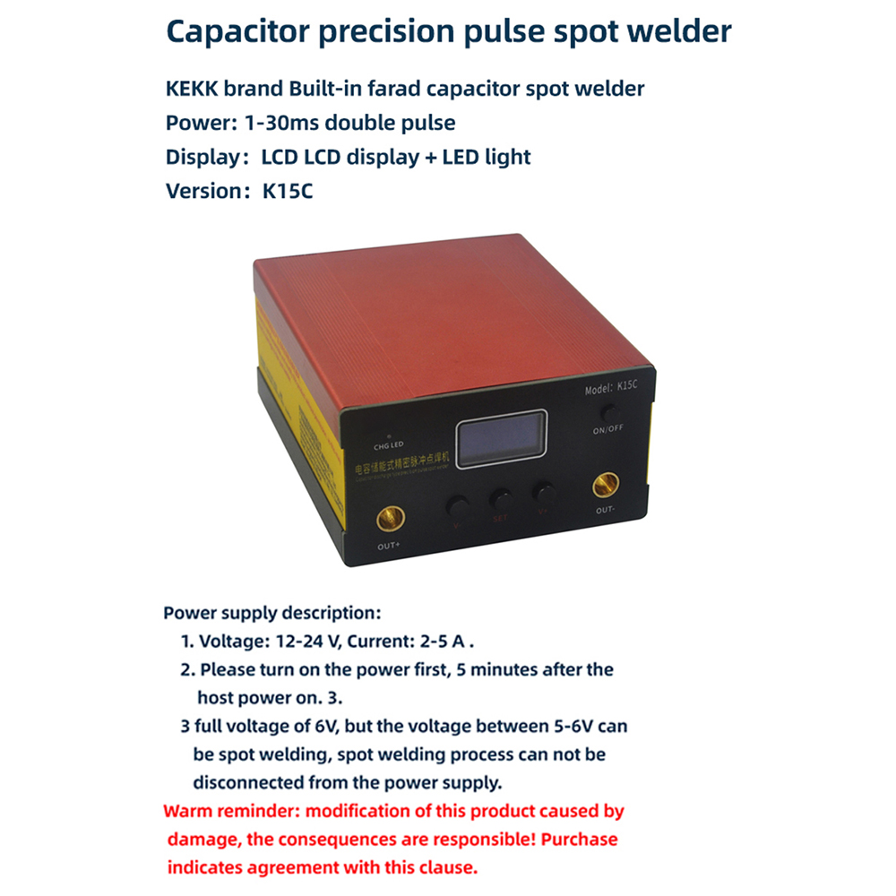 Parameters: Model: K15C Product Name: Pocket type spot welder for Faraday capacitors Grade:1-30ms double pulse Battery type:Farad capacitor Input interface: DC port Input voltage: 12-24V Input current:2-5A Spot welding material: nickel-plated sheet spot welding on stainless steel (steel) above Spot welding thickness: 0.1-0.15mm nickel-plated sheet