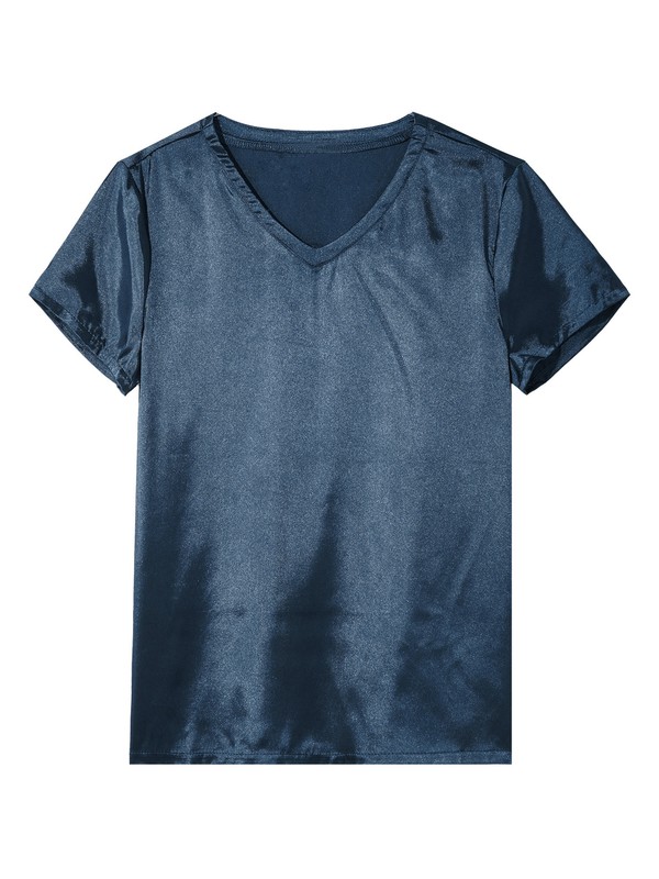 Men V Neck Short Sleeve Satin T-Shirt Loose Pajamas Tops Solid Color Loungewear Sleepwear Nightwear.