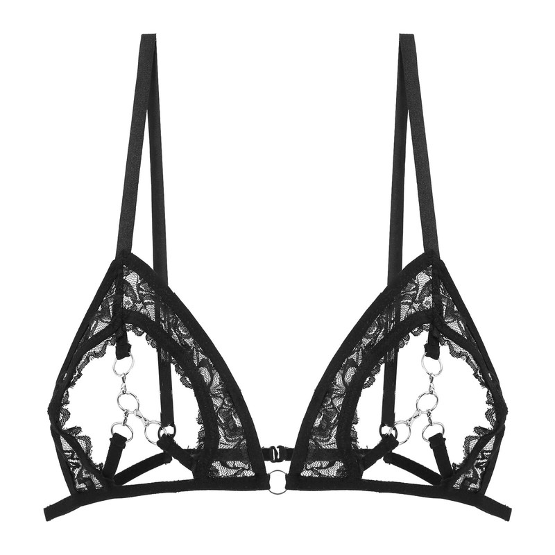 Adjustable spaghetti shoulder straps, open cups, metal rings linked at bust.