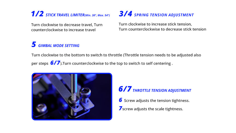 6. Various adjustments are possible: Stroke adjustment (max. 54°, min. 38°), Stretch adjustment, Rocker mode setting, Throttle force adjustment.