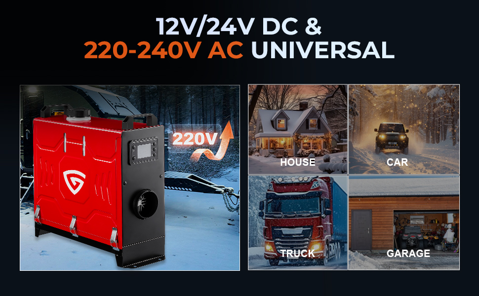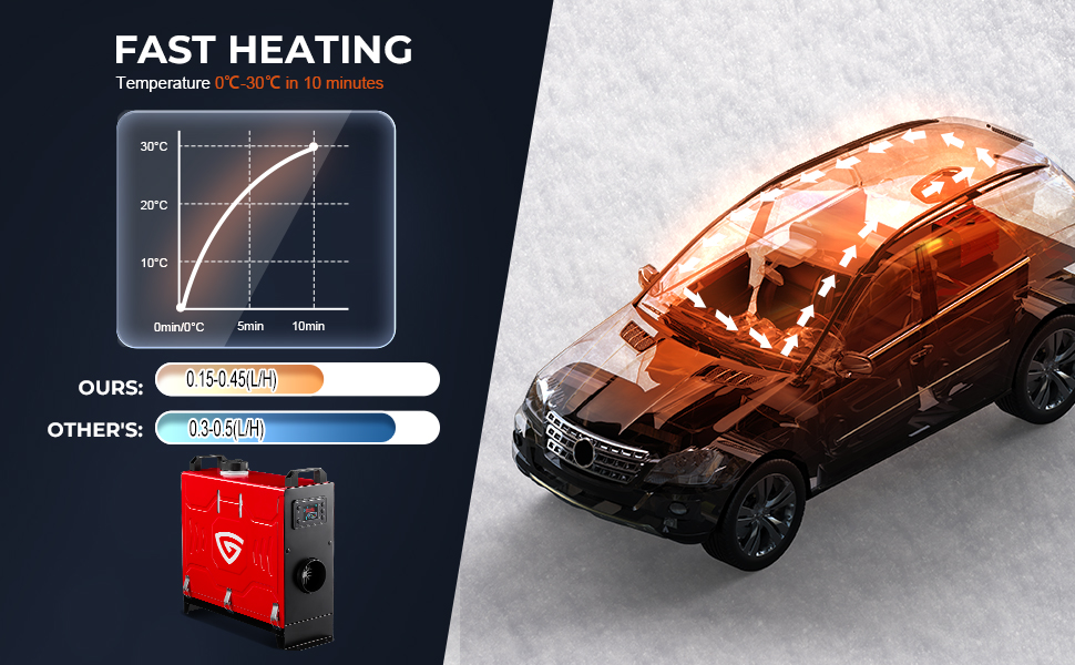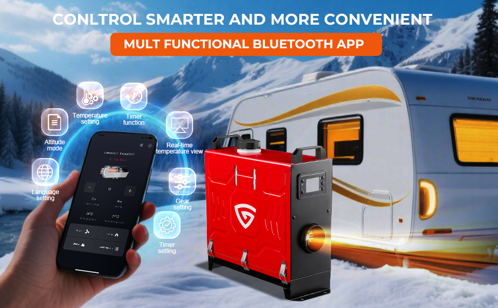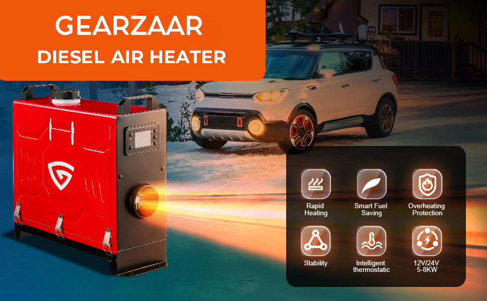 This 12V diesel heater offers features like constant temperature control, timing function, voice broadcasting, preheating, and overheating protection at ≥518°F (270°C). Use it safely in cars, RVs, boats, or indoors for worry-free comfort.
