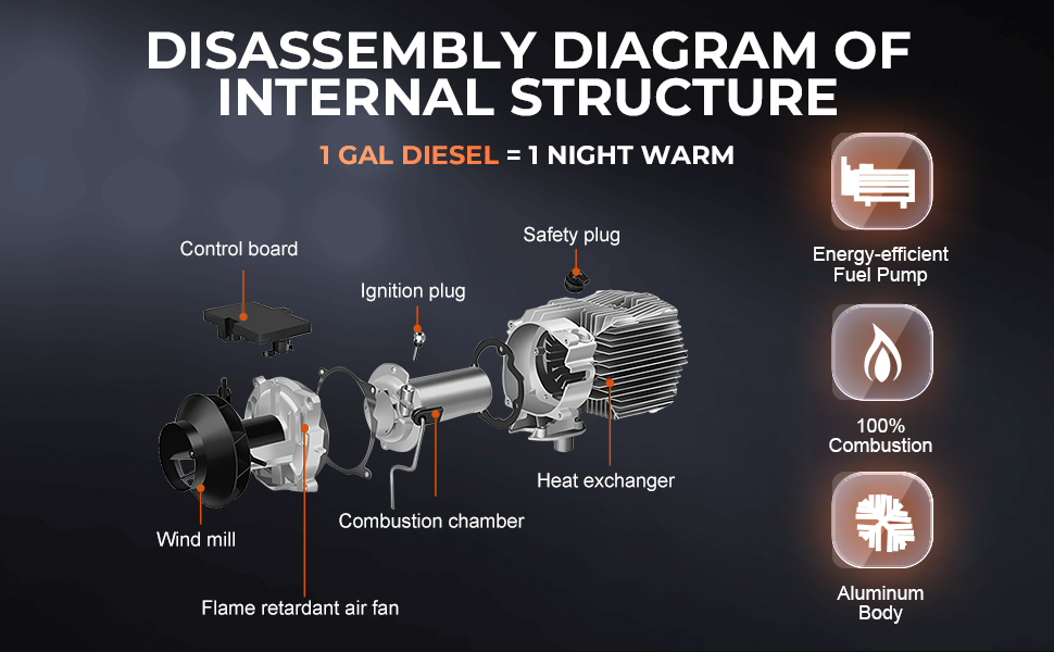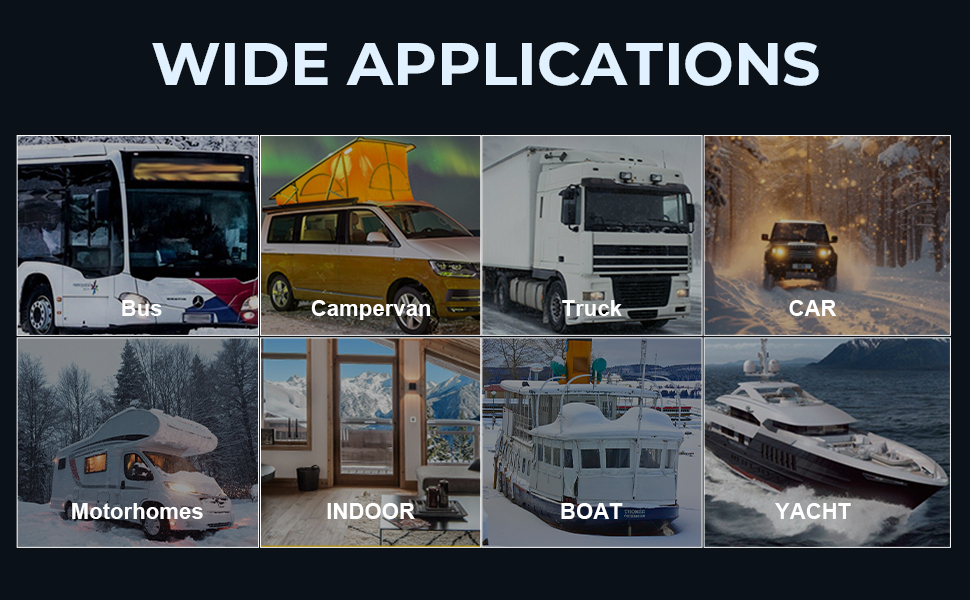 Enjoy efficient heating with our 8KW diesel heater—no installation required! Perfect for outdoor adventures like camping. Suitable for spaces of 215-269ft² (20-25m²), it quickly heats up your vehicle, boat, or cabin within 10 minutes using a high-performance aluminum heat exchanger.