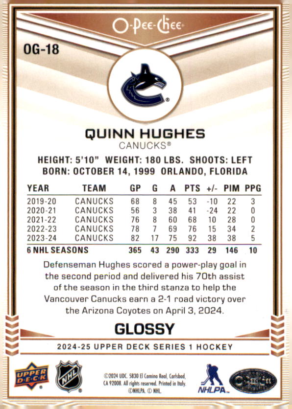 2024-25 Upper Deck O-Pee-Chee Glossy #OG18 Quinn Hughes Card