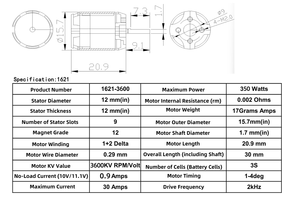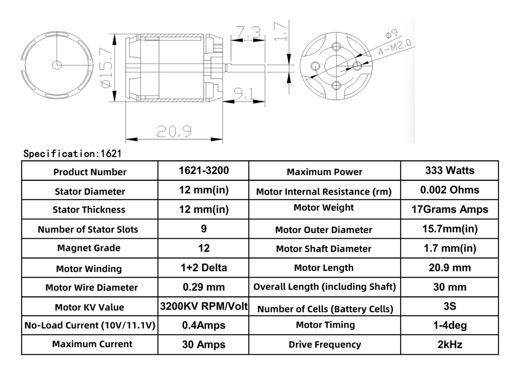 2. 1621 Brushless Outrunner Motor: 3200kv 3600kv, 0.29 mm output shaft. Works with 3S Cells lipo battery
