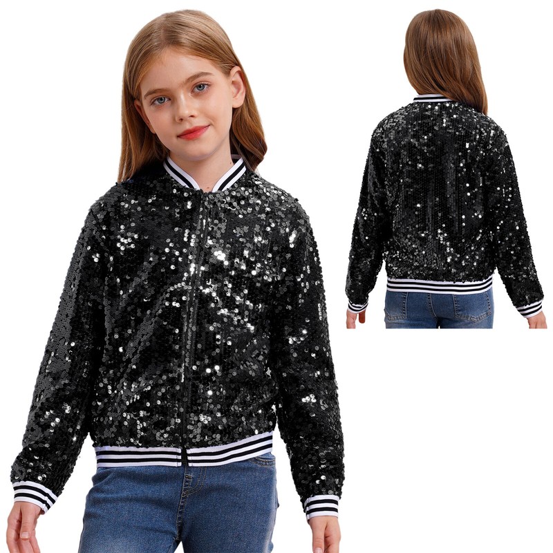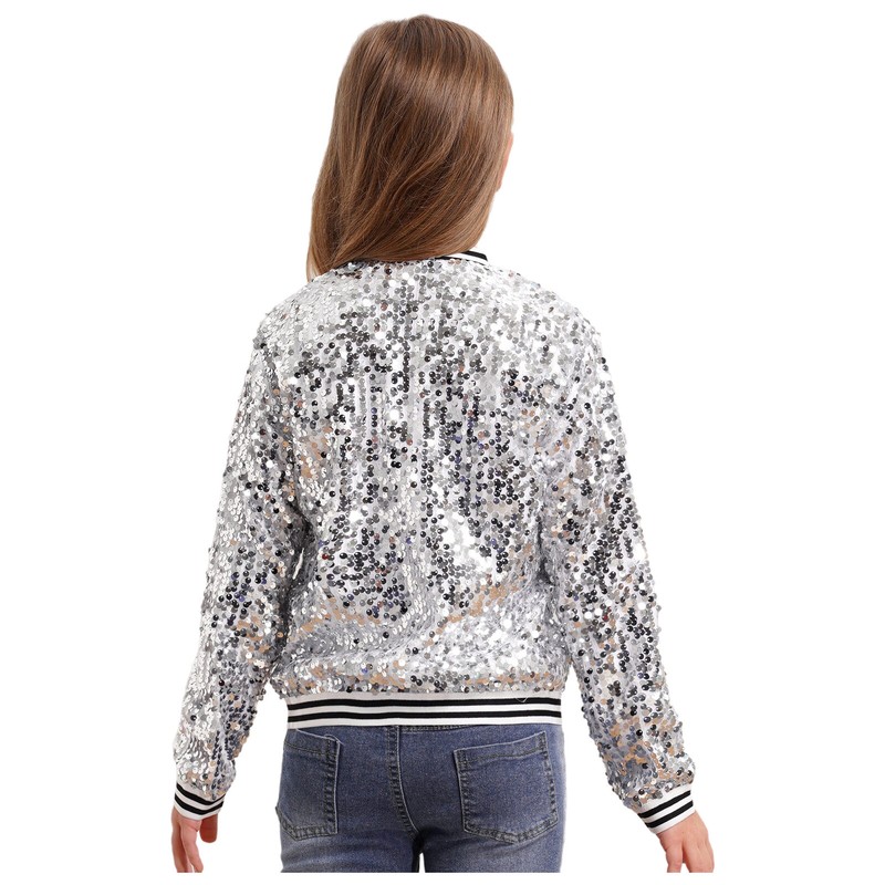 Designed with long sleeve, front zip up, elastic striped trim, allover sparkly sequin with smooth lined, which is a stylish bomber jacket.