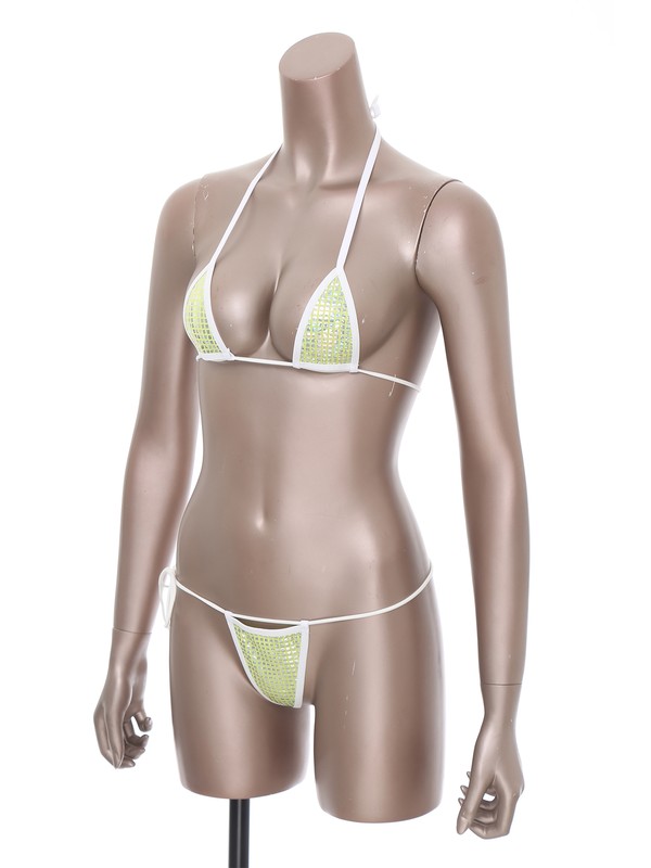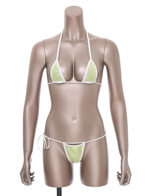 Neckholder-BH-Top und Tanga mit selbst zu bindenden Trägern sind an die Körperform anpassbar. Glitzernde Pailletten machen Sie noch auffälliger.