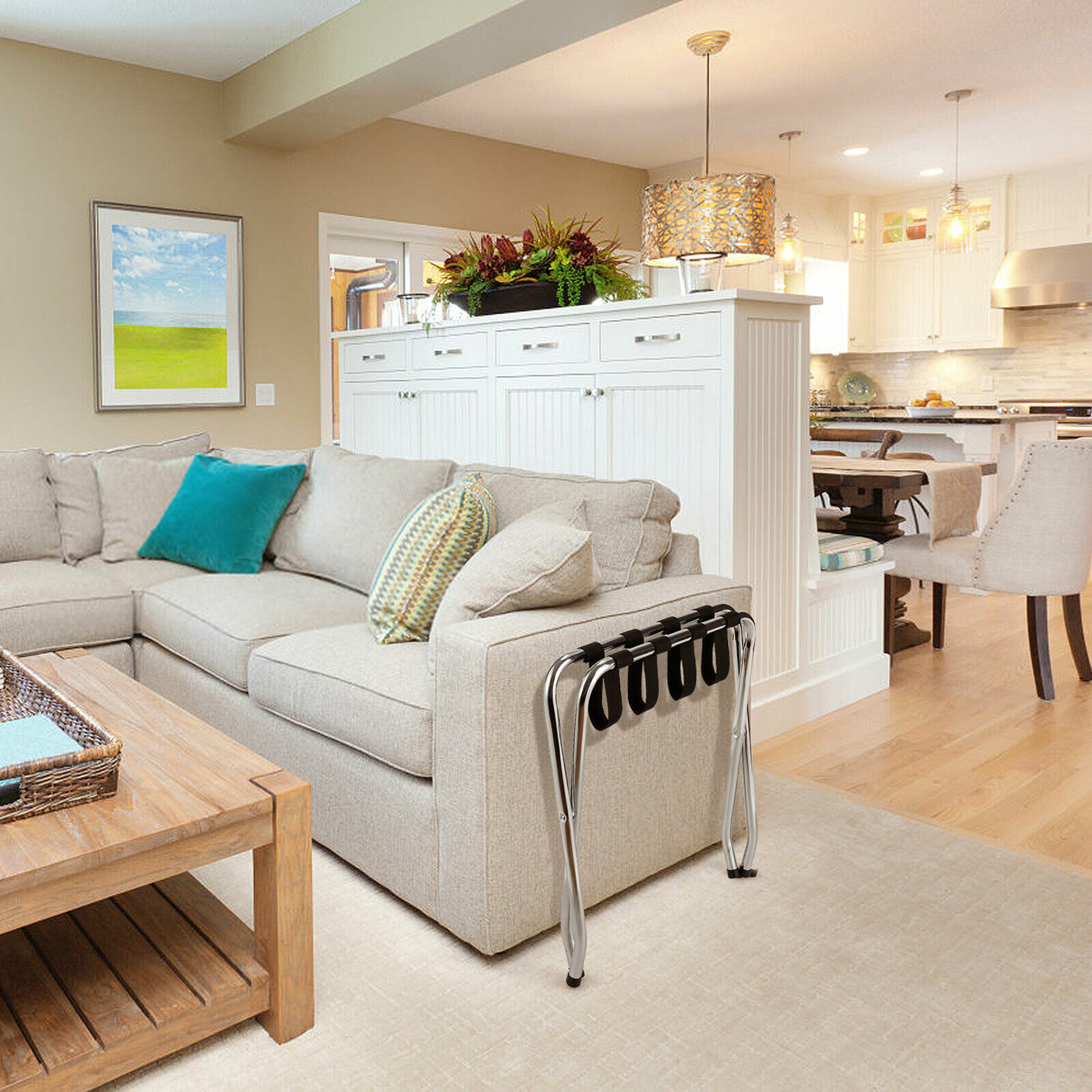 This luggage rack brings ultimate convenience to your guestroom. Whether you are heading out on the road or returning from a trip, this rack can make the packing or unpacking much more easily. The robust metal frame with sturdy nylon straps of this travel luggage rack gives it an attractive look and strong stability, thus it is also ideal for use in a guest room or a vacation home. Your guests will feel pampered with this convenient rack always at the ready next to a closet or at the end of the bed. When it is not in use, simply fold the household essentials luggage rack and store it out of sight until it is needed.