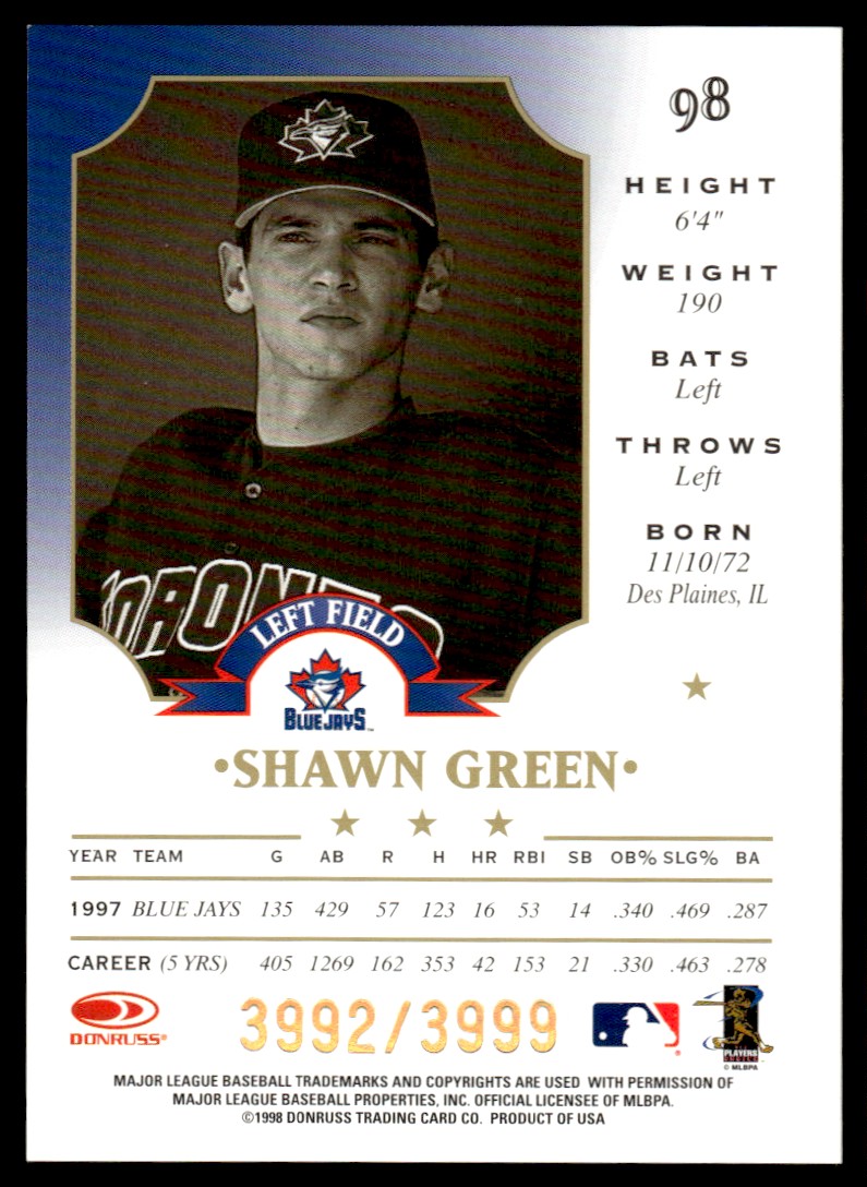 | 1998 Leaf Fractal Foundations Shawn Green 3992/3999 Toronto Blue Jays #98 | ||||||||||||||||||