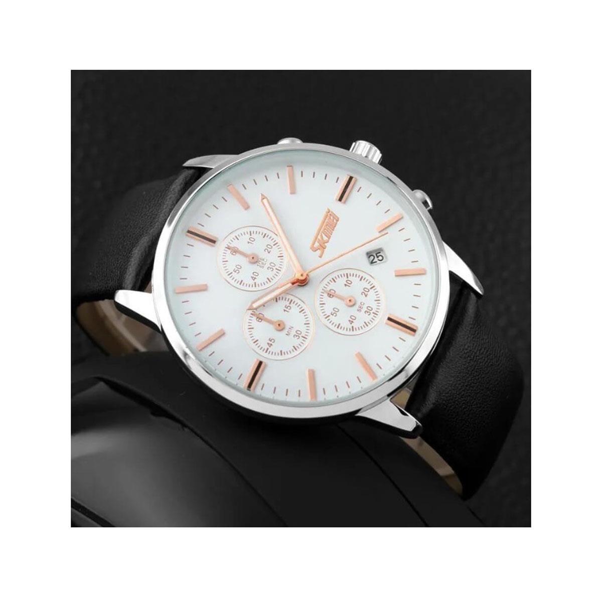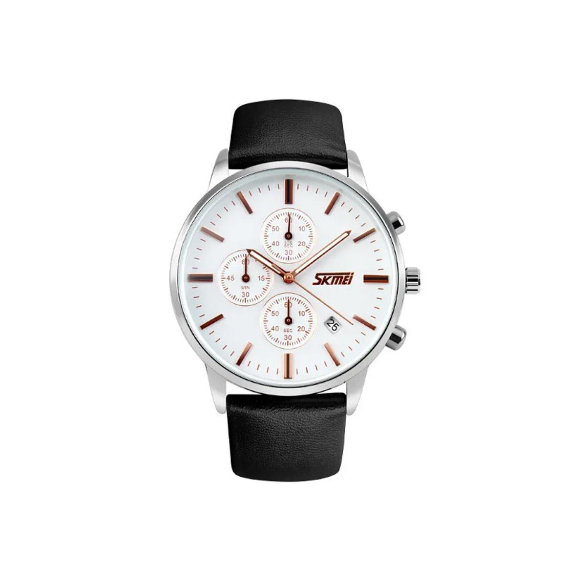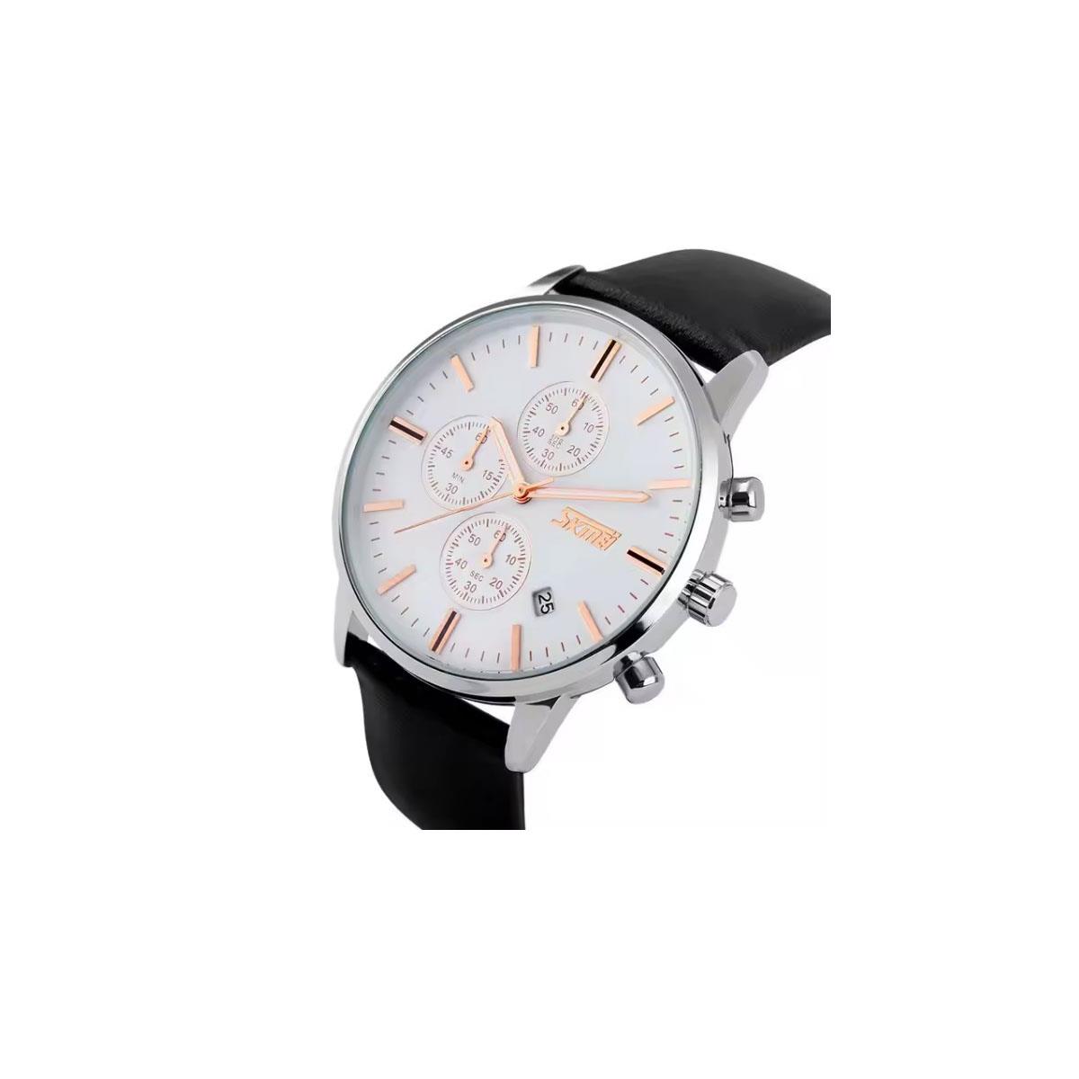 We are authorised distributors with a license to sell these original branded Skmei watches in the UK. This is a high quality mens watch. Our Skmei watches have proven a great hit with excellent durability and quality. It has a comfortable lightweight genuine leather strap that feels great and secure. It also has a silver bezel, three mini dials showing the seconds hand and a chronograph. The stunning face has classy rose gold indexes, a date dial and luminous hands . A unique, premium quality look with eye-catching design which is visually striking. Superb quality guaranteed with this Skmei watch. This watch has a width size of 42mm for a clear watch display.